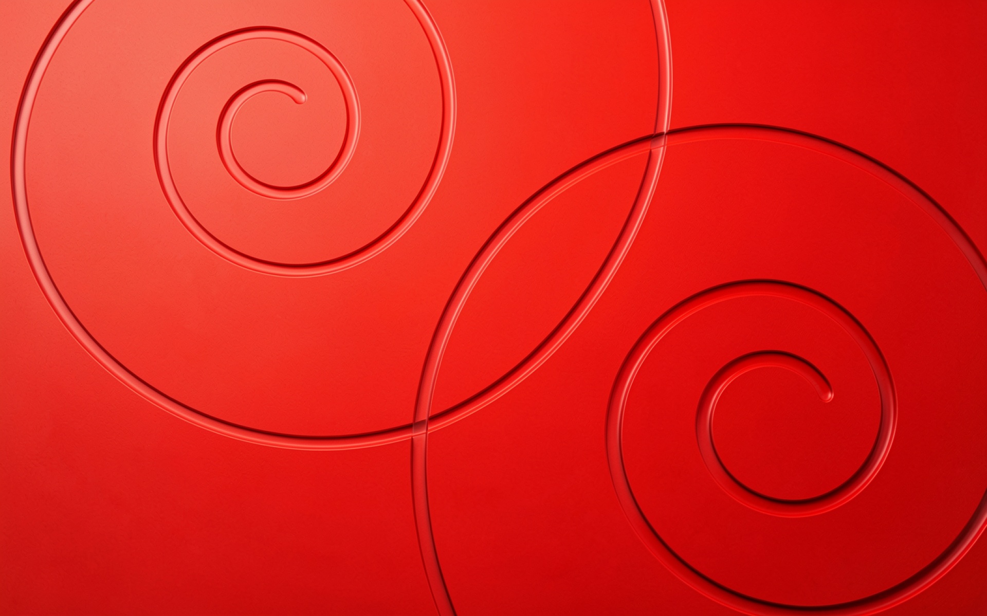 Изображение характеризуется глубоким насыщенным красным цветом с плавными градиентами фона. Текстура поверхности напоминает матовый пластик или окрашенный металл, где четкие линии спиралей создают эффект объема за счет тонких темных контуров и мягких бликов по краям желобков. Освещение распределено равномерно, что подчеркивает геометрию изгибов и чистоту композиции. На сайте доступен удобный предпросмотр перед скачиванием для оценки качества на экране.