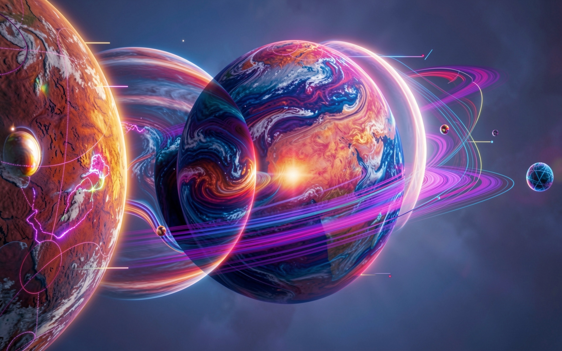 Здесь вы можете скачать JPG обои под названием 'Сюрреалистичные планеты в неоновом космическом пространстве', и почему вы должны это сделать: другие сайты обрезают края, но у нас есть полный кадр.