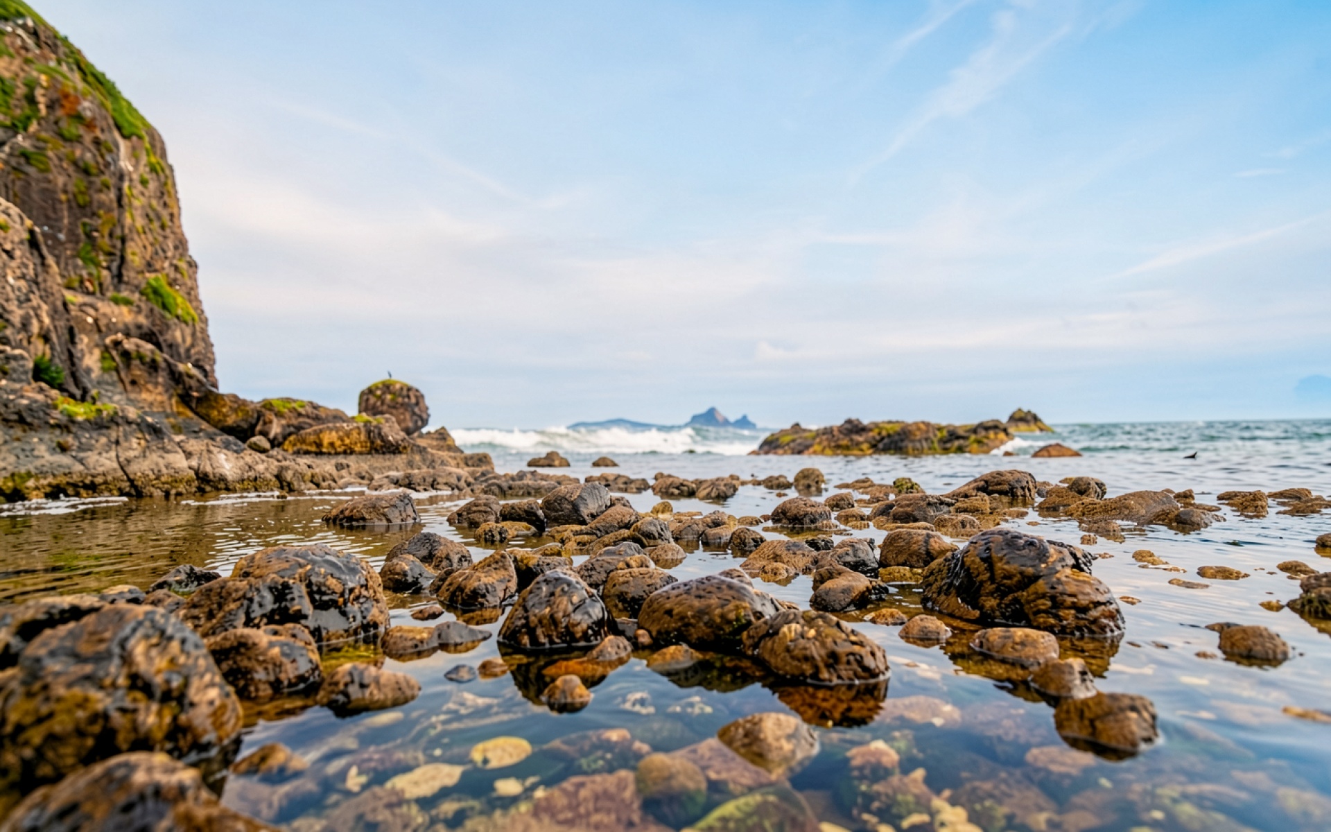 Изображение детально передает глянцевую текстуру мокрых валунов и плавные градиенты вечернего неба. Освещение создает мягкие блики на поверхности воды, подчеркивая контраст между темным базальтом и светлой пеной прибоя. Глубокие тени в расщелинах скал добавляют композиции объем. На сайте предусмотрен удобный предпросмотр перед загрузкой для оценки качества на экране.