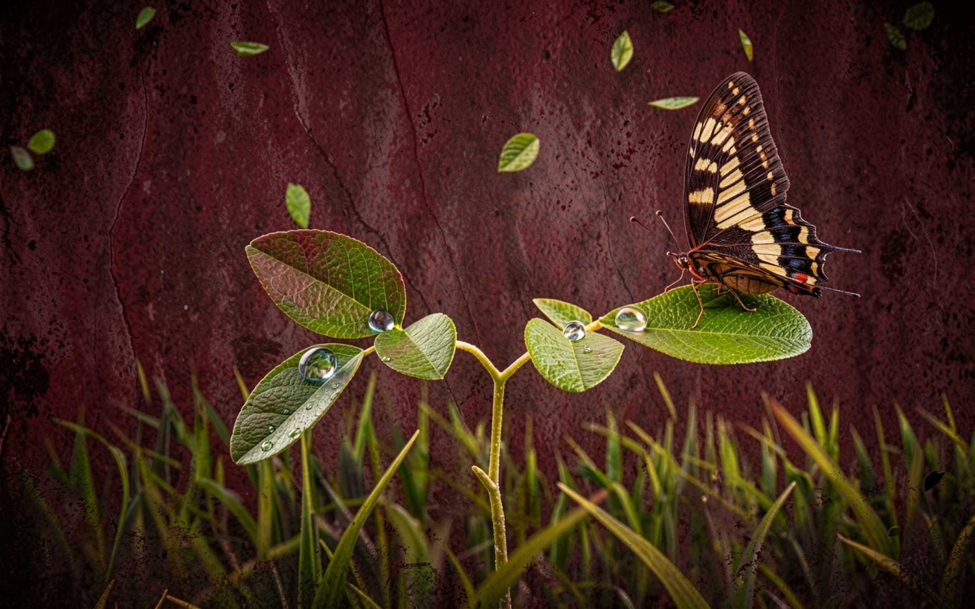 Изображение детально передает микротекстуру крыльев насекомого и глянцевую поверхность капель воды. Освещение создает мягкие блики на сферических объектах росы, а градиент темно-красного фона подчеркивает насыщенный зеленый цвет листвы. Контрастные тени добавляют глубины композиции, выделяя каждую прожилку растения. На сайте доступен удобный предпросмотр перед скачиванием для оценки качества на экране.