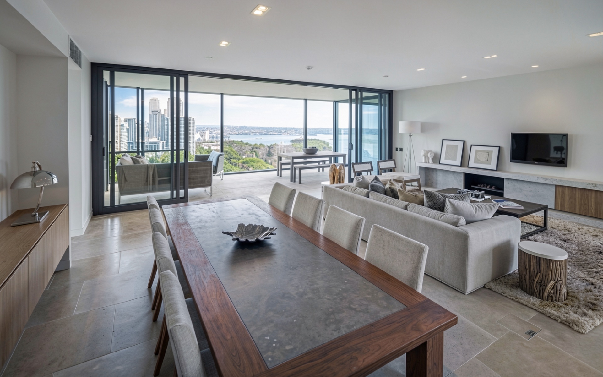 Загрузка JPG обоев Современный интерьер гостиной с панорамным видом с нашего сайта необходима, так как только здесь представлена оригинальная компрессия с минимальными потерями.