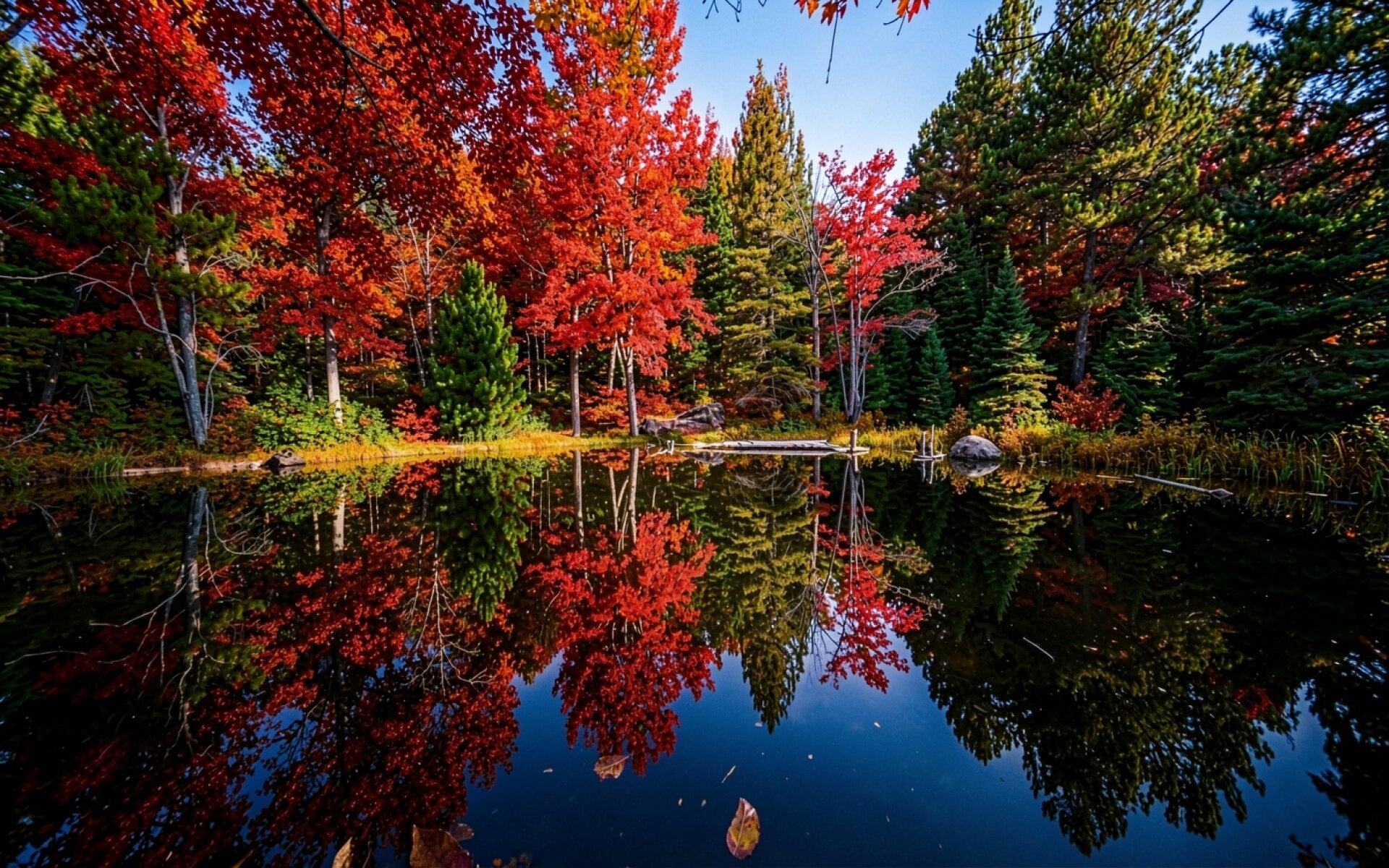 Изображение детально передает текстуру коры хвойных пород и яркость лиственного покрова. Контрастное освещение создает глубокие тени в гуще леса и выраженные блики на поверхности воды. Плавные градиенты синего неба переходят в насыщенные красные и оранжевые тона листвы, создавая объемную композицию. На сайте доступен удобный предпросмотр перед скачиванием для оценки качества отображения на экране.