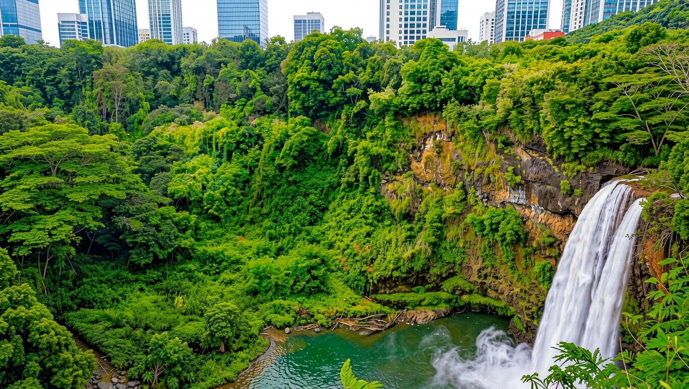 Изображение детально передает текстуру падающей воды и мох на скалистых выступах. Освещение распределено равномерно, создавая мягкие переходы между ярко-зеленой листвой джунглей и холодными оттенками стеклянных фасадов зданий. Глубокие тени в низинах подчеркивают объем рельефа, а градиенты неба плавно сливаются с городской застройкой. На сайте доступен удобный предпросмотр перед загрузкой для оценки качества на экране.