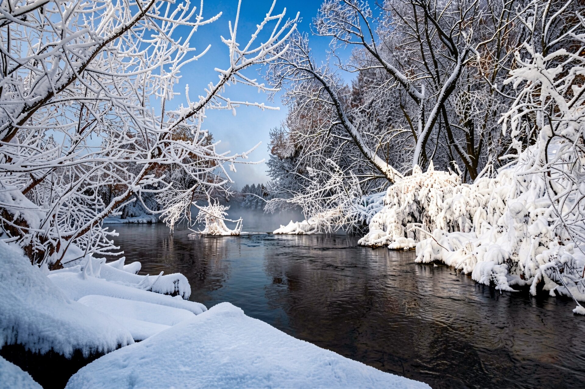 На нашем сайте вы можете скачать обои в JPG для ПК или телефона Зимний пейзаж заснеженной реки в лесу. Почему стоит скачать JPG обои Зимний пейзаж заснеженной реки в лесу именно у нас? Потому что здесь нет полос градиента из-за низкого битрейта.