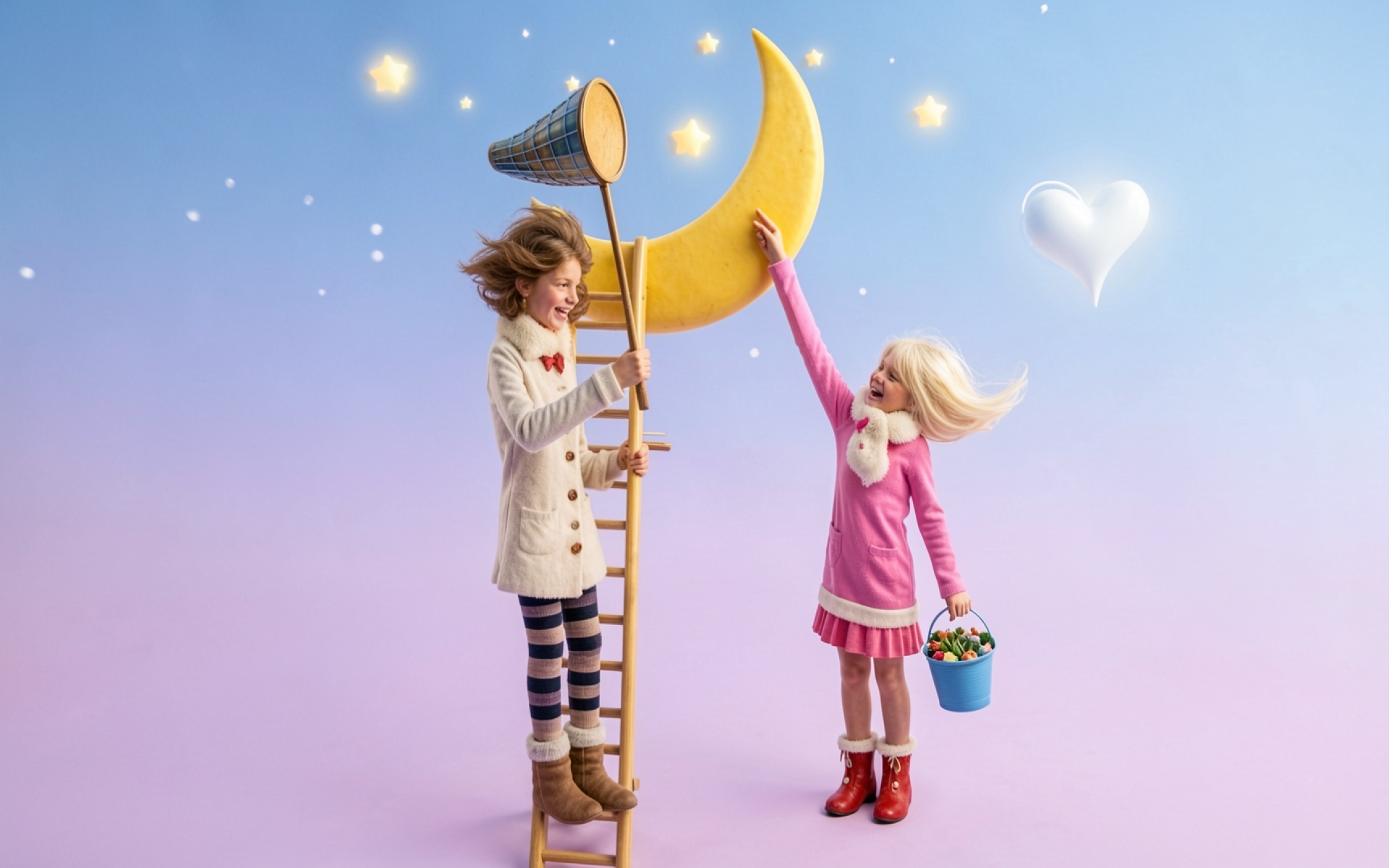 Изображение отличается детальной проработкой текстур шерстяных пальто и мягким градиентом перехода от фиолетового основания к голубому зениту. Освещение имитирует рассеянный студийный свет, который создает плавные блики на поверхности луны и подчеркивает объем белого сердца. Контраст между насыщенным желтым цветом полумесяца и пастельным фоном обеспечивает визуальную глубину сцены. На сайте доступен удобный предпросмотр перед скачиванием для оценки качества на экране.