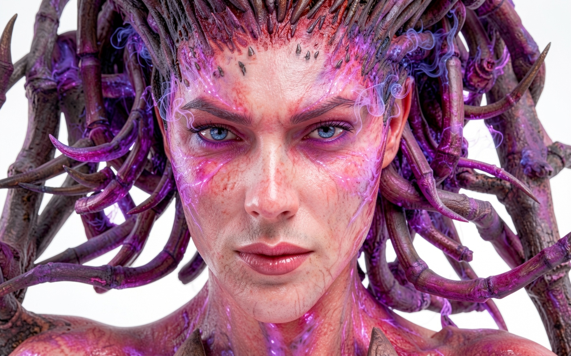 Изображение отличается детальной проработкой текстуры кожи и органических наростов. Особое внимание уделено контрасту между холодным неоновым свечением фиолетовых элементов и естественным тоном лица. Мягкие тени подчеркивают объем щупальцев, а блики на радужке глаз создают эффект живого взгляда. Плавные переходы цвета в фоновых градиентах обеспечивают глубину композиции. Сайт предоставляет удобный предпросмотр перед загрузкой для оценки качества на вашем экране.