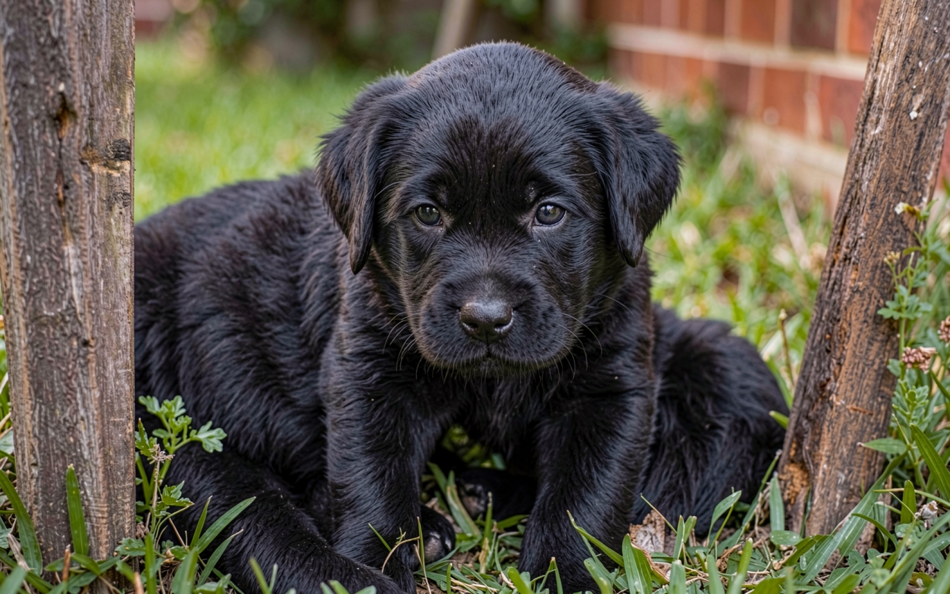 Черный щенок лабрадора в зеленой траве обои