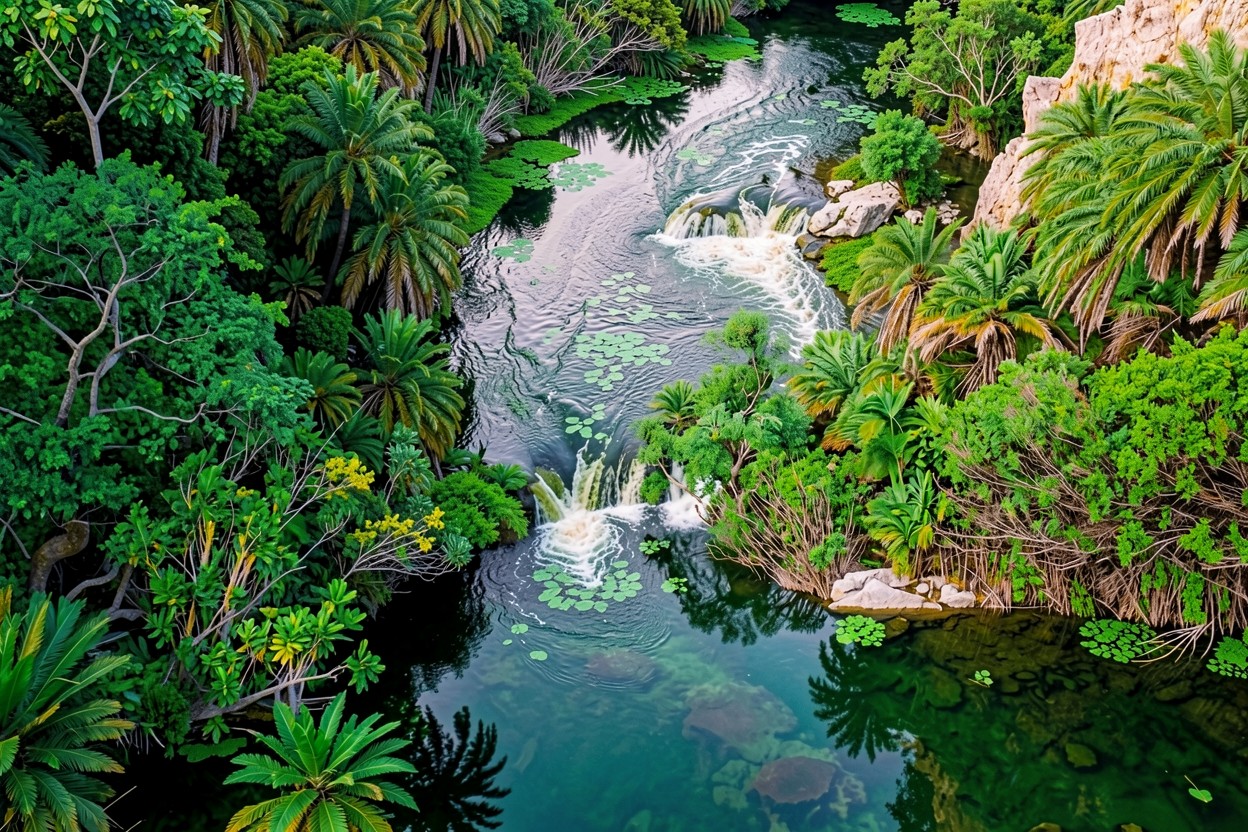 Изображение детально передает текстуру влажных листьев пальм и пенную массу падающей воды. Освещение распределено равномерно, создавая мягкие блики на поверхности реки и глубокие тени в гуще растительности. Градиенты зеленого цвета плавно переходят от изумрудного к салатовому, подчеркивая объем джунглей. Перед загрузкой доступен удобный предпросмотр для оценки качества отображения всех элементов сцены на вашем экране.