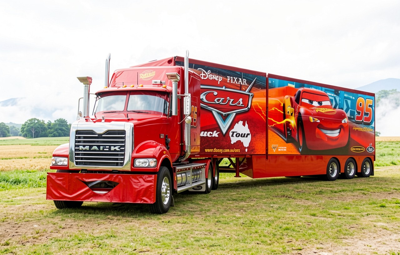 Красный грузовик с рисунком Молнии Маккуина на траве обои
