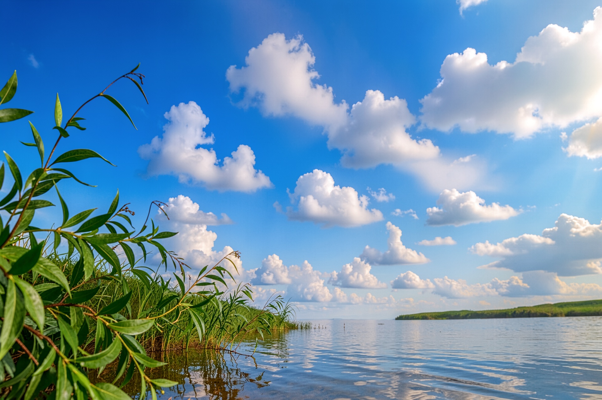Летний пейзаж озера с белыми облаками обои