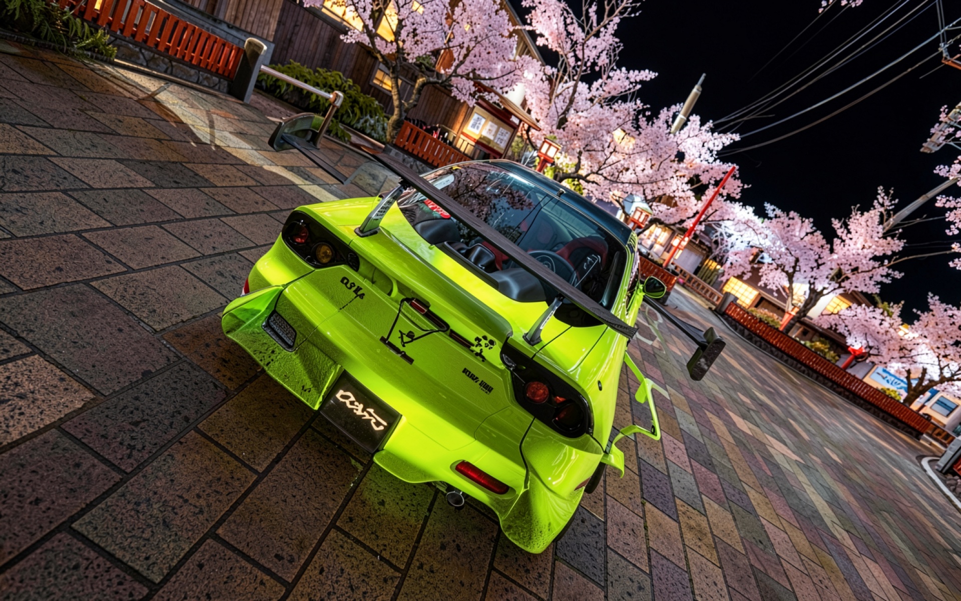 Техническое исполнение кадра акцентирует внимание на глянцевом покрытии кузова и четких гранях обвеса. Освещение создает выраженные блики на изгибах автомобиля, а глубокие тени подчеркивают контраст с плиткой мостовой. Градиенты ночного неба плавно переходят в мягкий свет цветущей сакуры, создавая объемную композицию. На сайте доступен удобный предпросмотр перед скачиванием для оценки качества на экране.