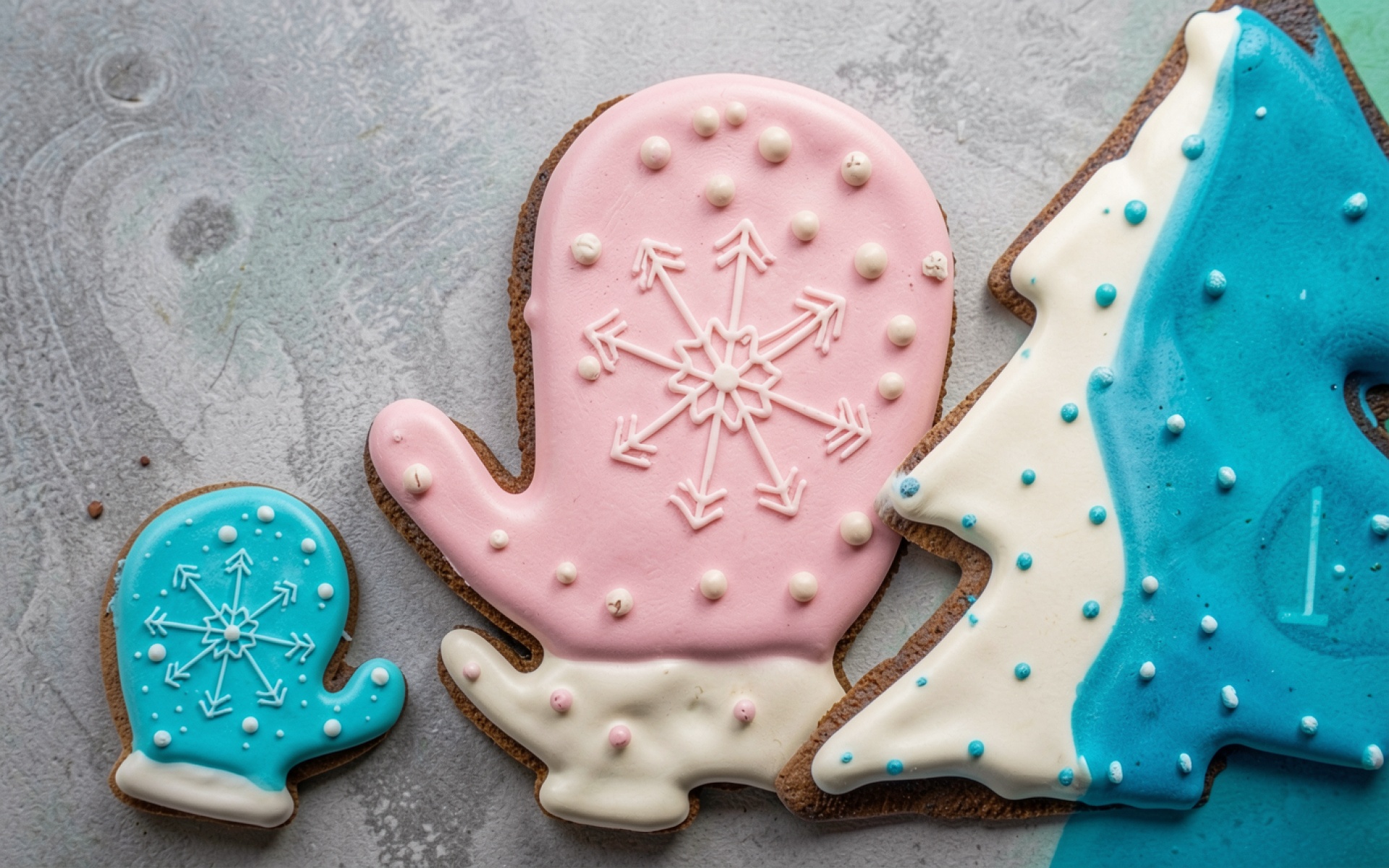 Изображение демонстрирует детальную текстуру сахарной глазури с характерным глянцевым блеском. Освещение создает мягкие блики на розовых и голубых поверхностях, подчеркивая объемный рельеф снежинок и мелких жемчужных бусин. Фон имеет нейтральный серый градиент с имитацией бетонной поверхности, что создает контраст с яркими цветами кондитерских изделий. На сайте доступен удобный предпросмотр перед скачиванием для оценки качества на экране.