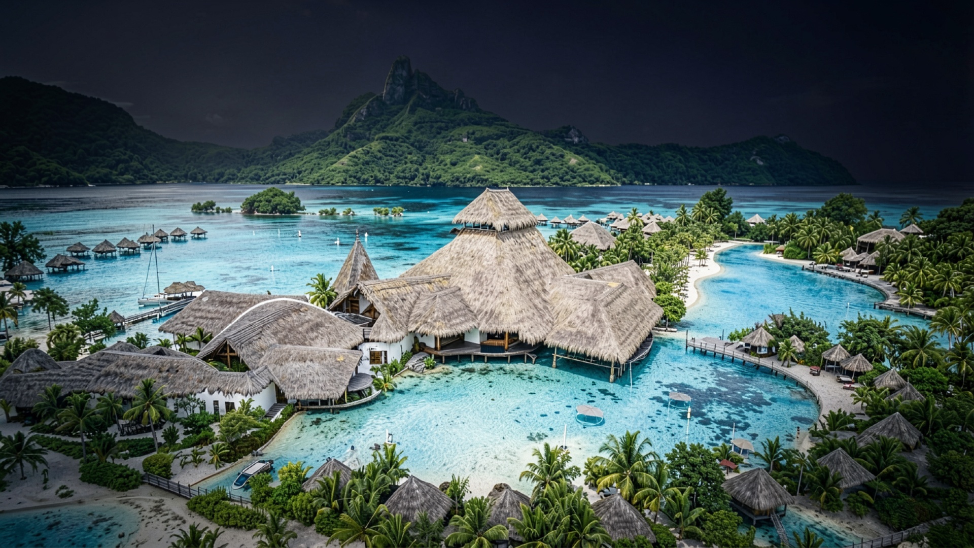 Согласно данным nationalgeographic.com, традиционные полинезийские хижины с крутыми скатами крыш проектируются таким образом, чтобы максимально эффективно отводить тропические ливни и обеспечивать естественную вентиляцию внутренних помещений за счет пористой структуры растительных материалов. Нажмите кнопку скачивания, чтобы установить эти обои с курортом на ваш ПК или телефон прямо сейчас.