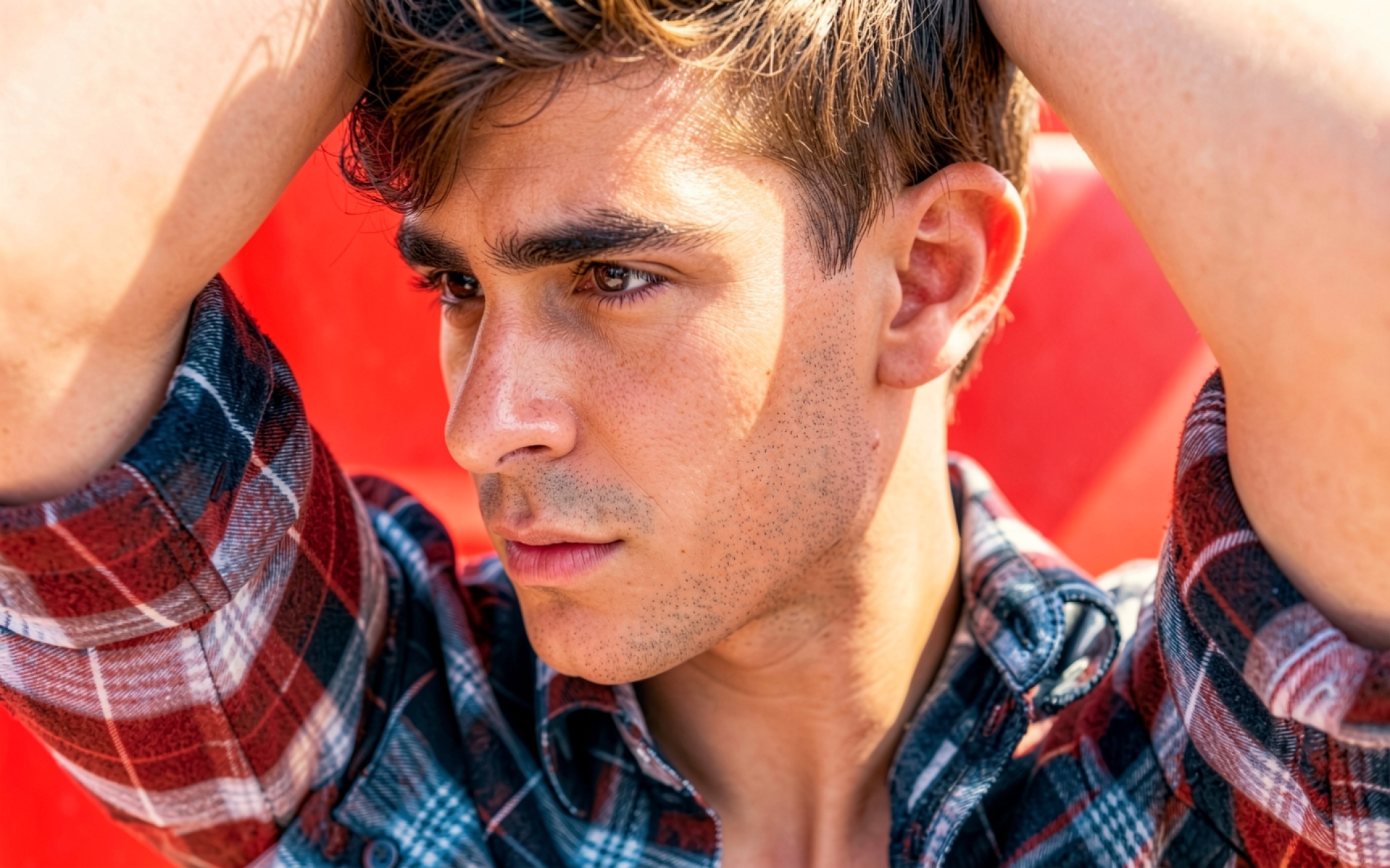 Портрет молодого мужчины в красной клетчатой рубашке обои