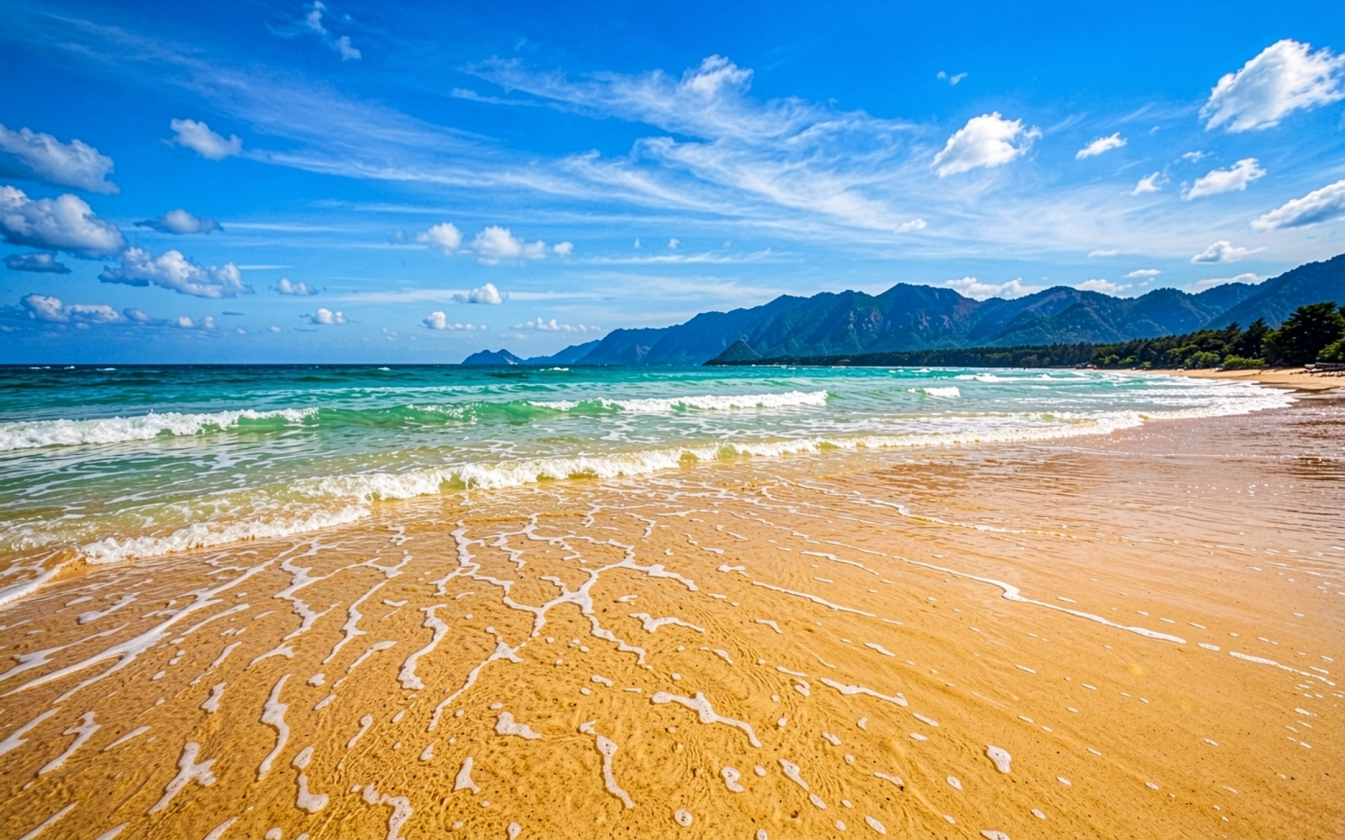 Изображение детально передает текстуру влажного песка и пенные гребни прибрежных волн. Освещение имитирует яркий зенитный свет, создавая контрастные блики на поверхности воды и мягкие градиенты в синеве неба. Глубокие тени в складках горных массивов подчеркивают объем ландшафта. На сайте доступен удобный предпросмотр перед скачиванием для оценки качества отображения на экране.
