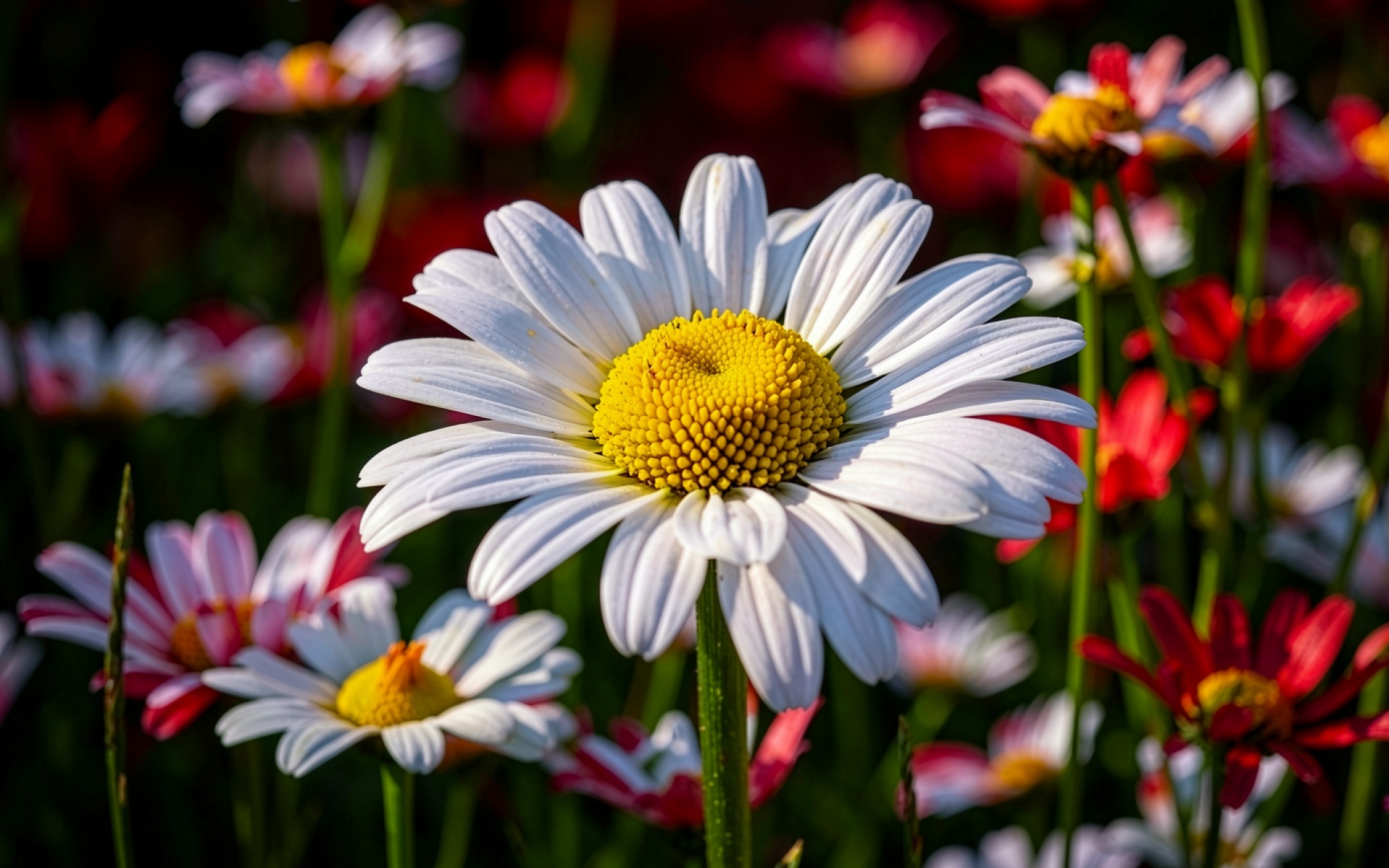 Скачайте с нашего сайта обои Белая ромашка в солнечном летнем саду в формате JPG, так как файл оптимизирован для установки на рабочий стол и экран телефона.