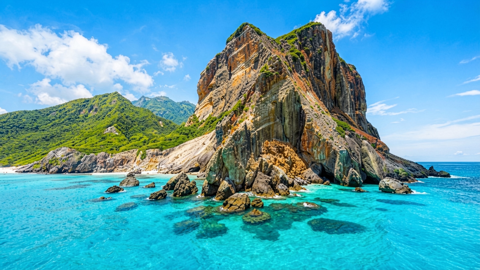 Доступны для скачивания JPG обои 'Скалистый остров в бирюзовом океане при дневном свете'. Почему стоит скачать их? Они подходят для профессионального редактирования без артефактов.