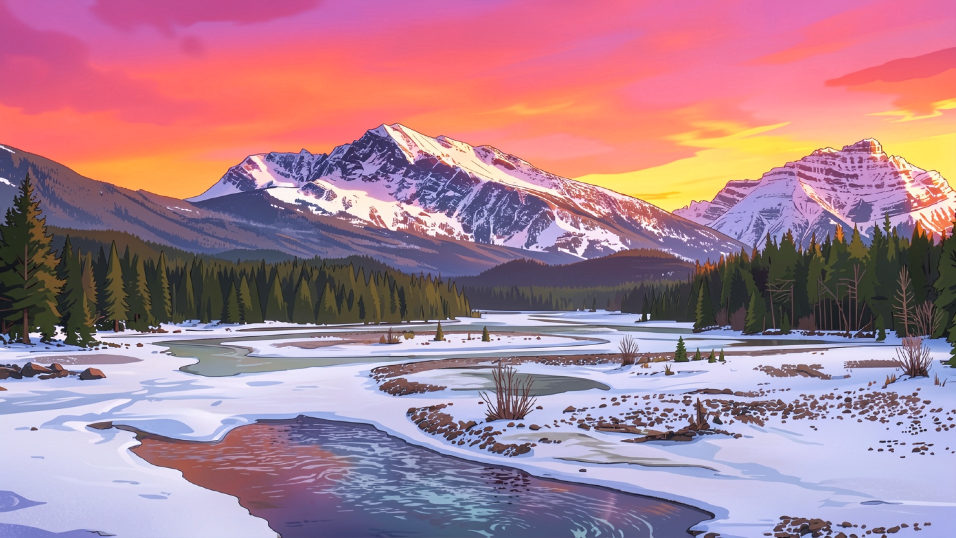 Изображение детально передает текстуру заснеженных склонов и плотность хвойного леса. Освещение имитирует мягкий вечерний свет, создавая плавные градиенты от ярко-розового до золотистого в небе. Контрастные тени на вершинах гор подчеркивают рельеф скал, а отражения в незамерзшей воде реки добавляют глубины композиции. На сайте предусмотрен удобный предпросмотр перед загрузкой для оценки качества отображения на вашем экране.