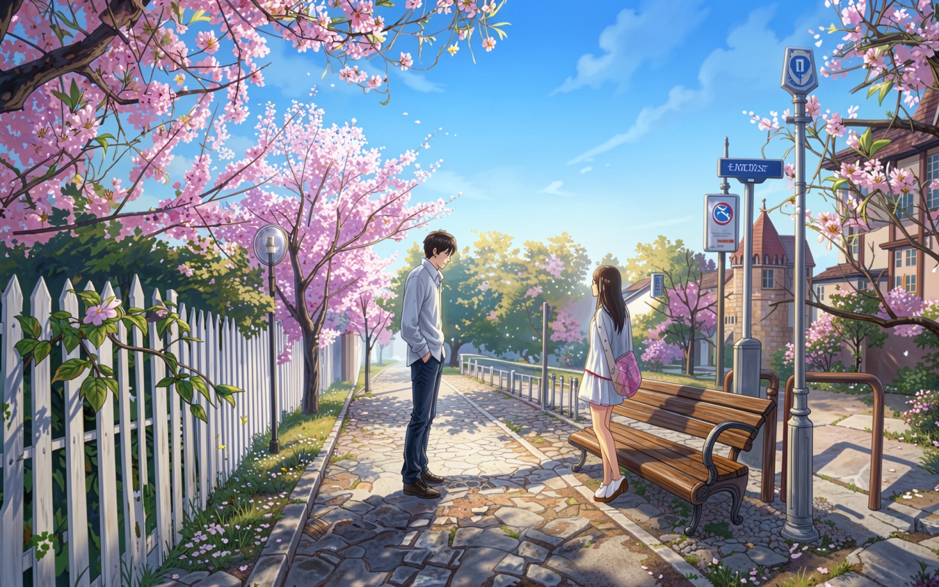 Изображение отличается детальной проработкой лепестков сакуры и мягким градиентом голубого неба. Освещение имитирует яркий дневной свет, создавая четкие контрастные тени на каменной мостовой и блики на белом заборе. Текстуры дерева скамьи и ткани одежды переданы с помощью плавных переходов тонов. На сайте доступен удобный предпросмотр перед загрузкой для оценки качества отображения на вашем экране.