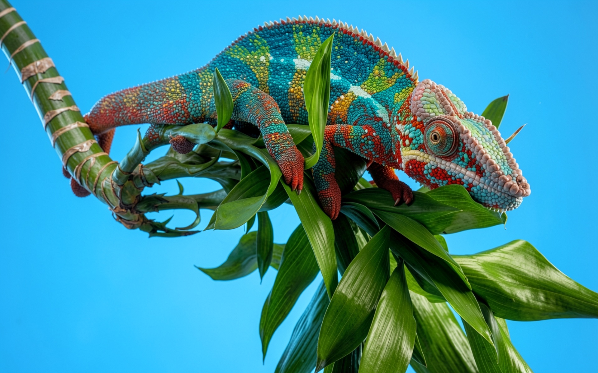 Наш ресурс дает вам возможность скачать обои 'Разноцветный хамелеон на зеленых листьях синий фон' в JPG, и причина в том, что изображение подверглось минимальному сжатию с сохранением деталей.