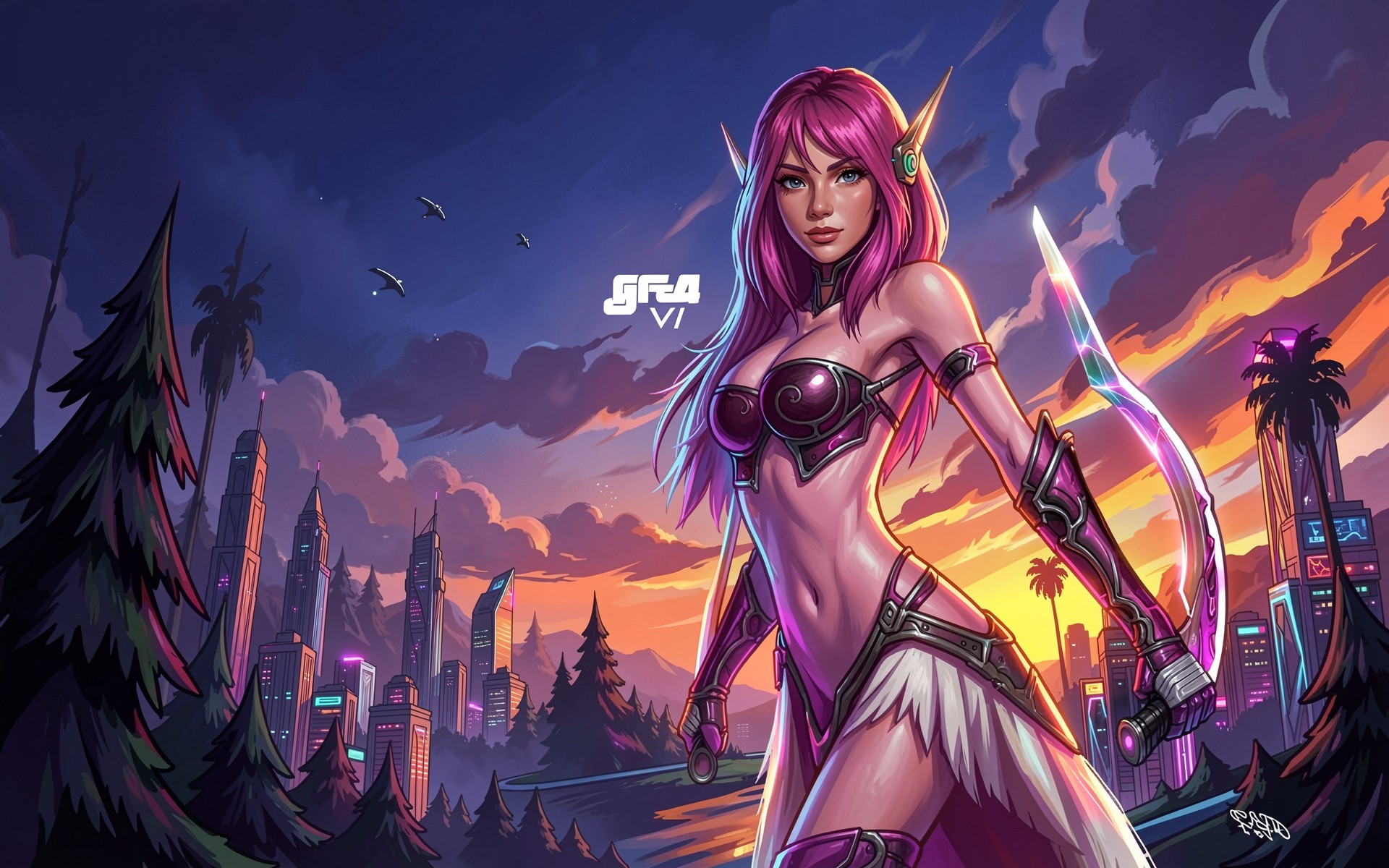 Розовая эльфийка с мечом в неоновом городе обои