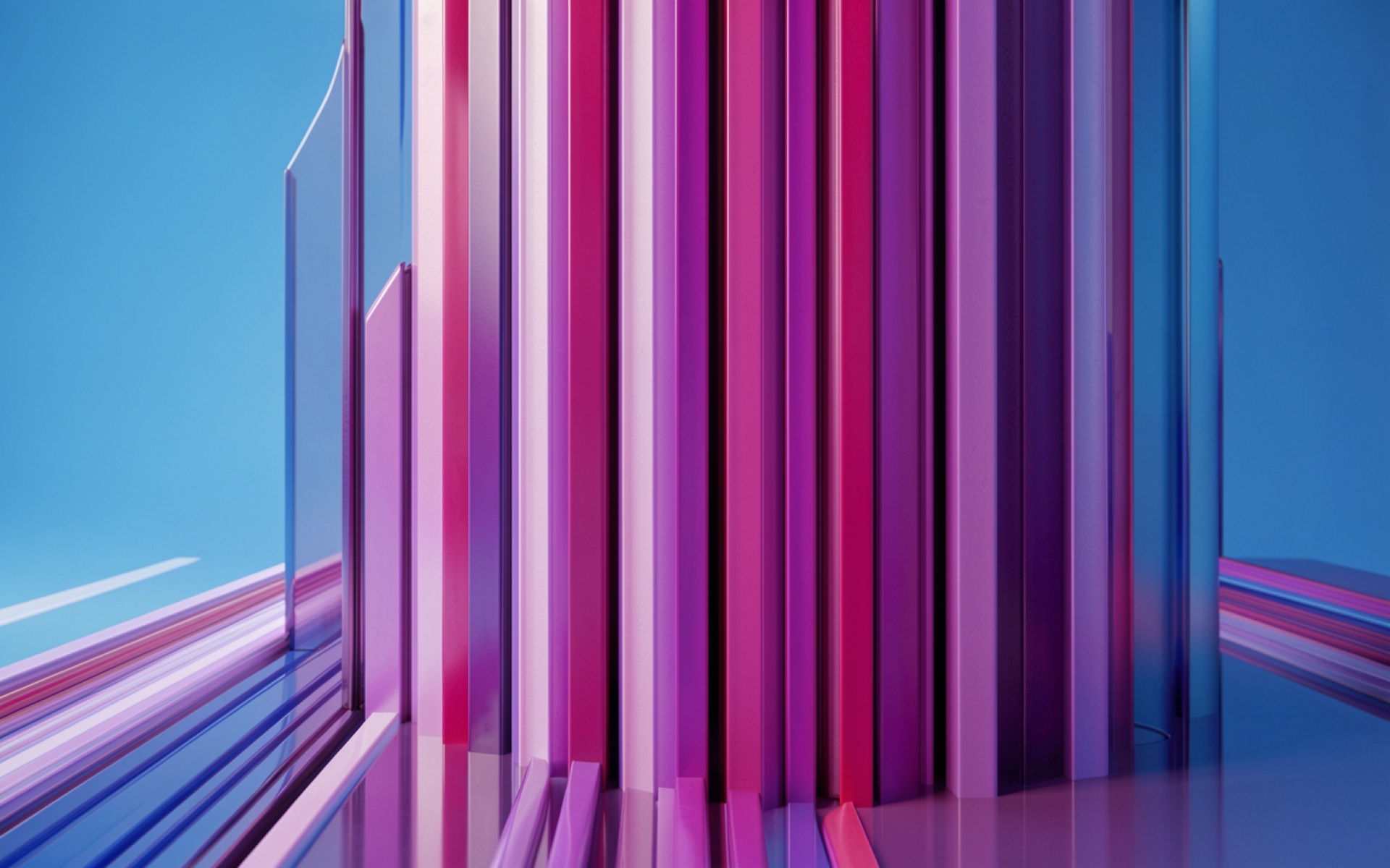 Техническое исполнение композиции опирается на контраст между насыщенными пурпурными оттенками и глубоким синим градиентом заднего плана. Вертикальные структуры обладают глянцевой текстурой, которая создает четкие блики и мягкие переходы теней на каждой грани. Освещение распределено равномерно, подчеркивая объем геометрических форм и чистоту цветовых переходов. Перед загрузкой на сайте доступен удобный предпросмотр для оценки качества отображения на вашем экране.