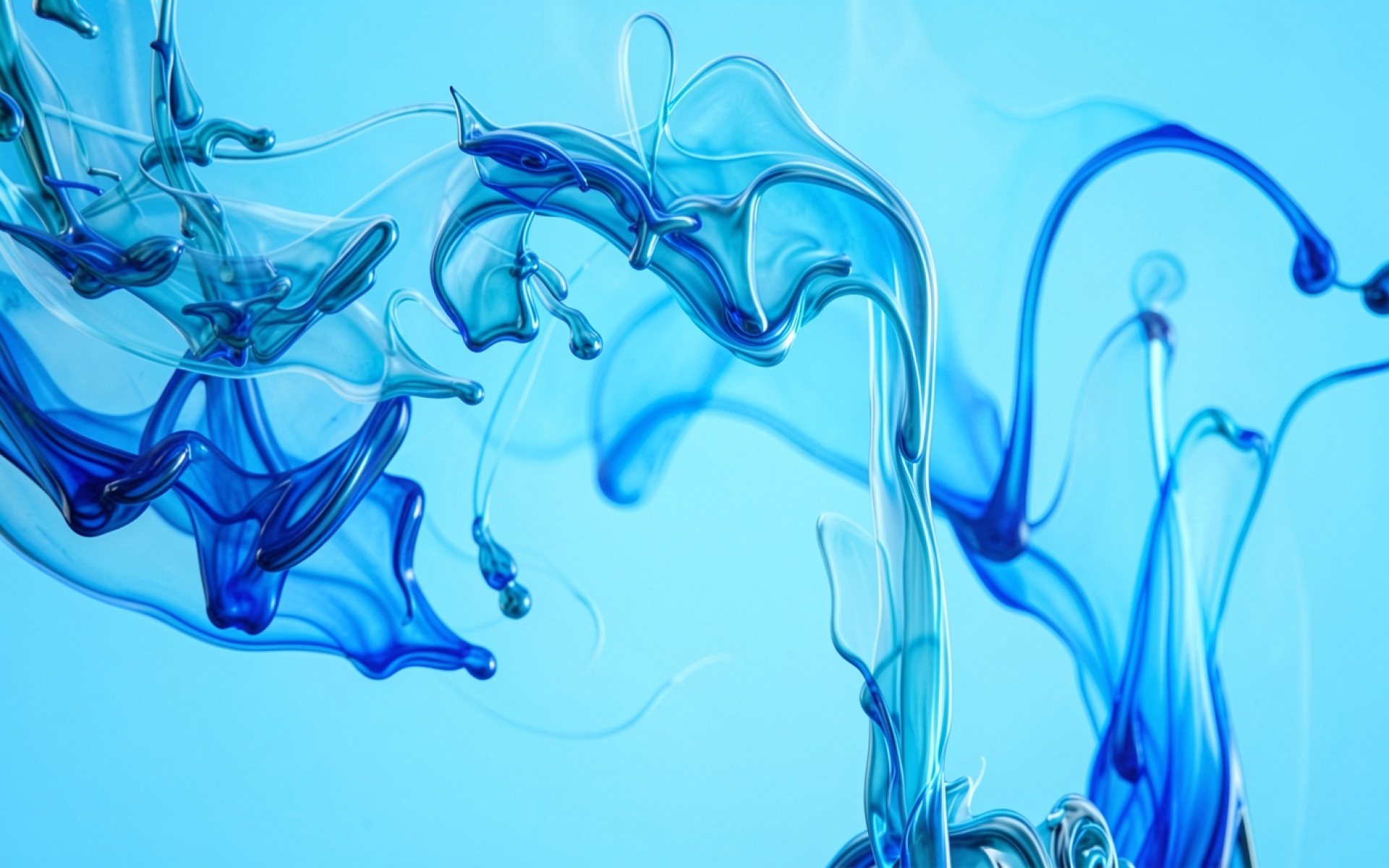 Изображение демонстрирует сложную динамику потоков жидкости с плавными градиентами от глубокого ультрамарина до светлого лазурного. Особое внимание уделено детализации тонких нитей и капель, которые создают объем за счет контрастных бликов и мягких теней внутри вихрей. Фон имеет однородный голубой оттенок, что подчеркивает прозрачность структур чернил. На сайте доступен удобный предпросмотр перед скачиванием для оценки качества на экране.