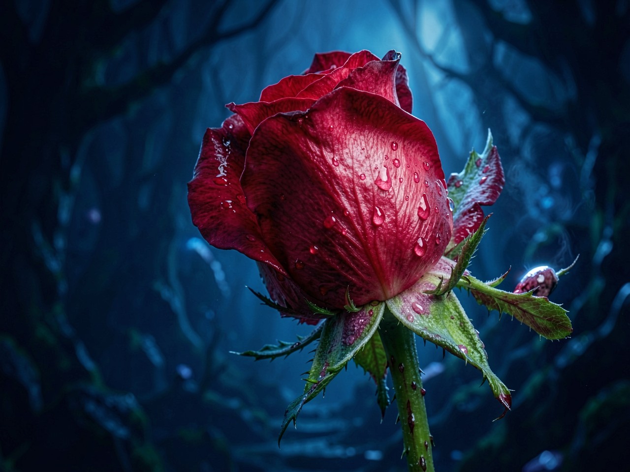 Изображение выделяется глубоким контрастом между насыщенным алым цветом лепестков и холодными синими оттенками заднего плана. Детализация капель воды создает эффект объема за счет четких бликов и микроскопических отражений света. Мягкие градиенты в тенях подчеркивают бархатистую текстуру цветка, а направленное освещение акцентирует внимание на изгибах бутона. Перед загрузкой доступен удобный предпросмотр для оценки качества отображения всех элементов на вашем экране.