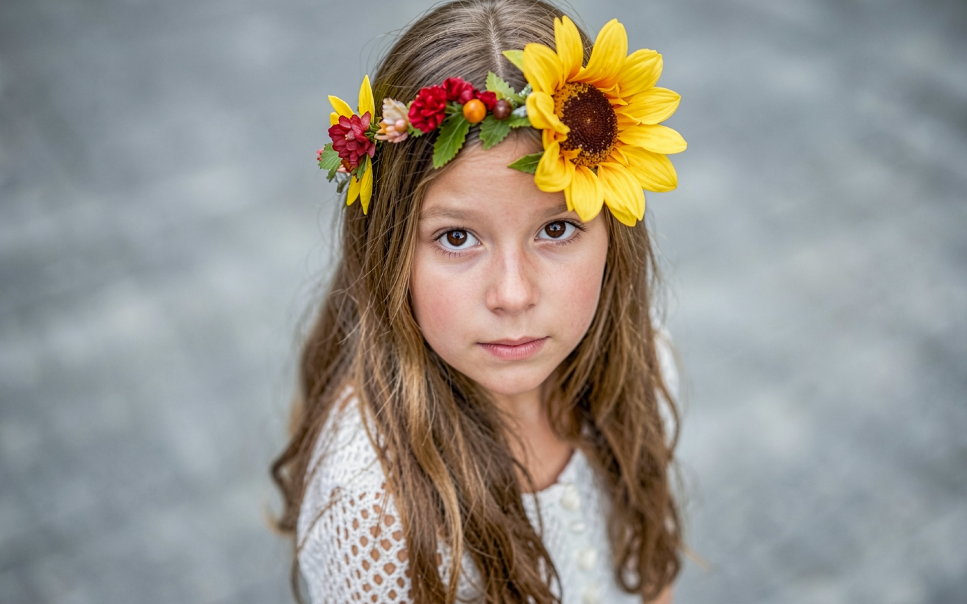 Девочка в венке из желтых подсолнухов обои