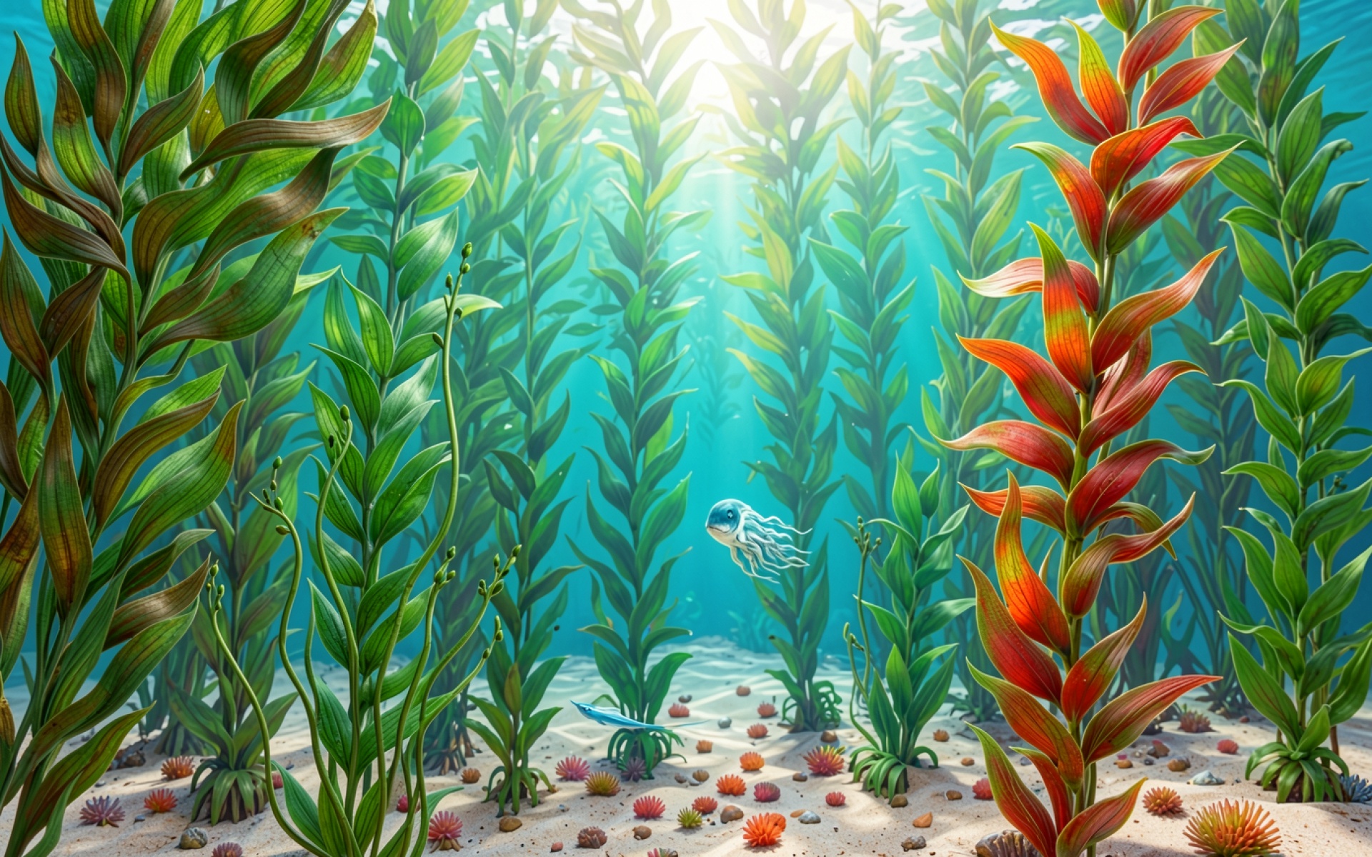 Изображение детально передает текстуру морских растений и прозрачность купола медузы. Освещение имитирует прохождение солнечных лучей сквозь толщу воды, создавая мягкие градиенты синего и зеленого цветов. Контрастные красные оттенки водорослей на переднем плане подчеркнуты глубокими тенями, что придает сцене объем. На сайте доступен удобный предпросмотр перед скачиванием для оценки качества отображения на экране.