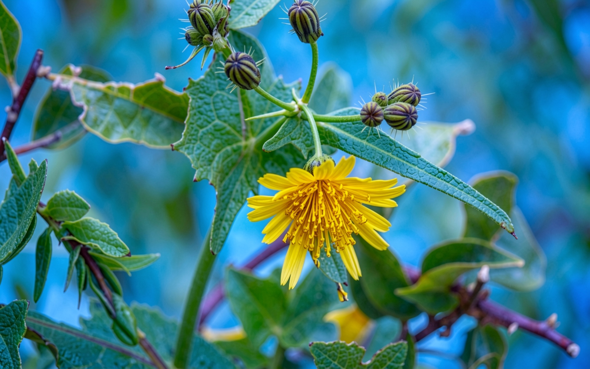 Желтый цветок с зелеными листьями на синем фоне обои