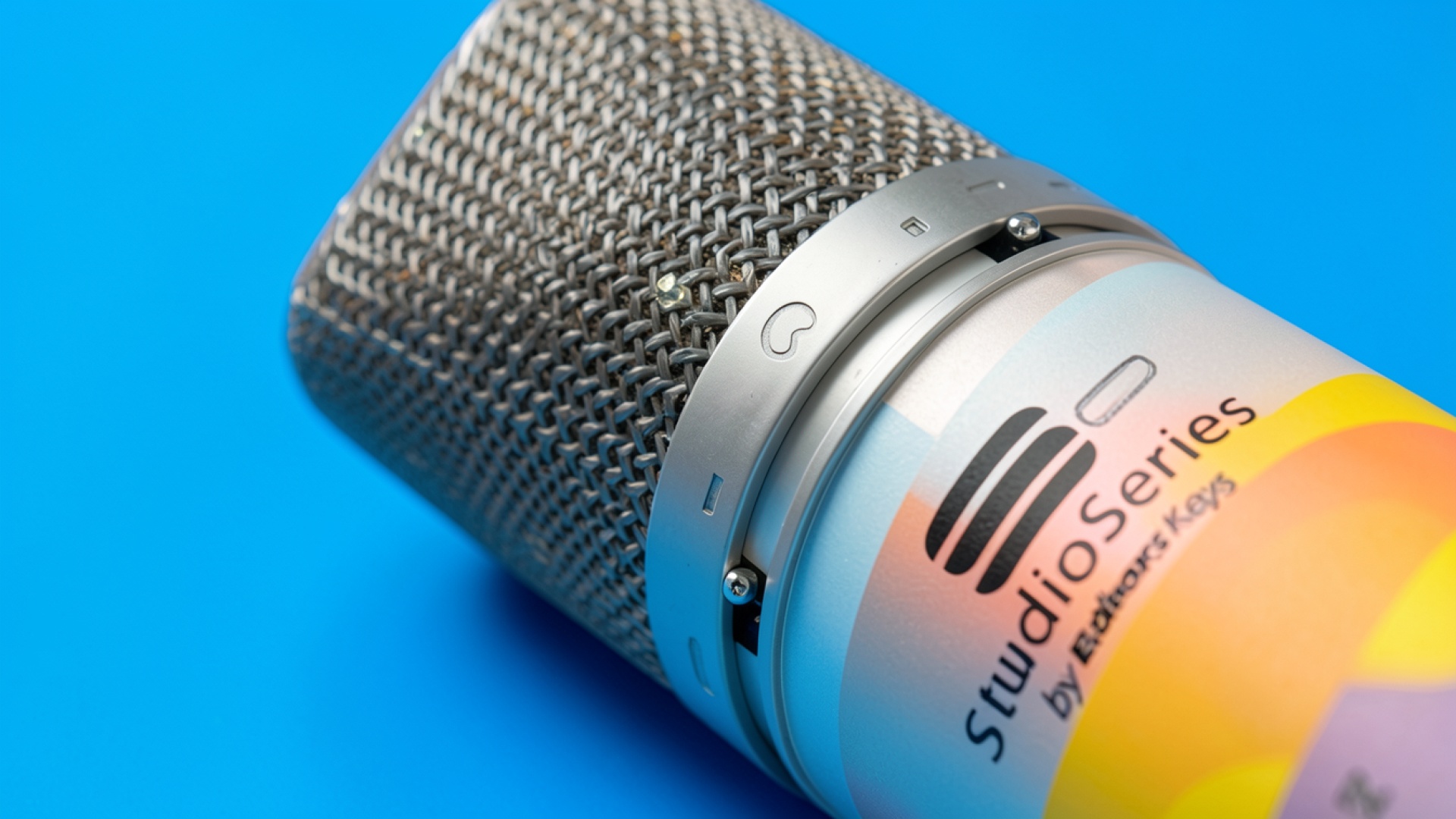 Техническое исполнение кадра подчеркивает металлическую текстуру сетчатого поп-фильтра и матовую поверхность корпуса. Освещение создает мягкие блики на стальных элементах, а глубокий синий градиент фона обеспечивает высокий контраст с теплыми желтыми и оранжевыми оттенками логотипа StudioSeries. Четкие тени подчеркивают объем устройства, а плавные переходы цветов создают эффект глубины пространства. На сайте доступен удобный предпросмотр перед загрузкой для оценки качества на вашем экране.