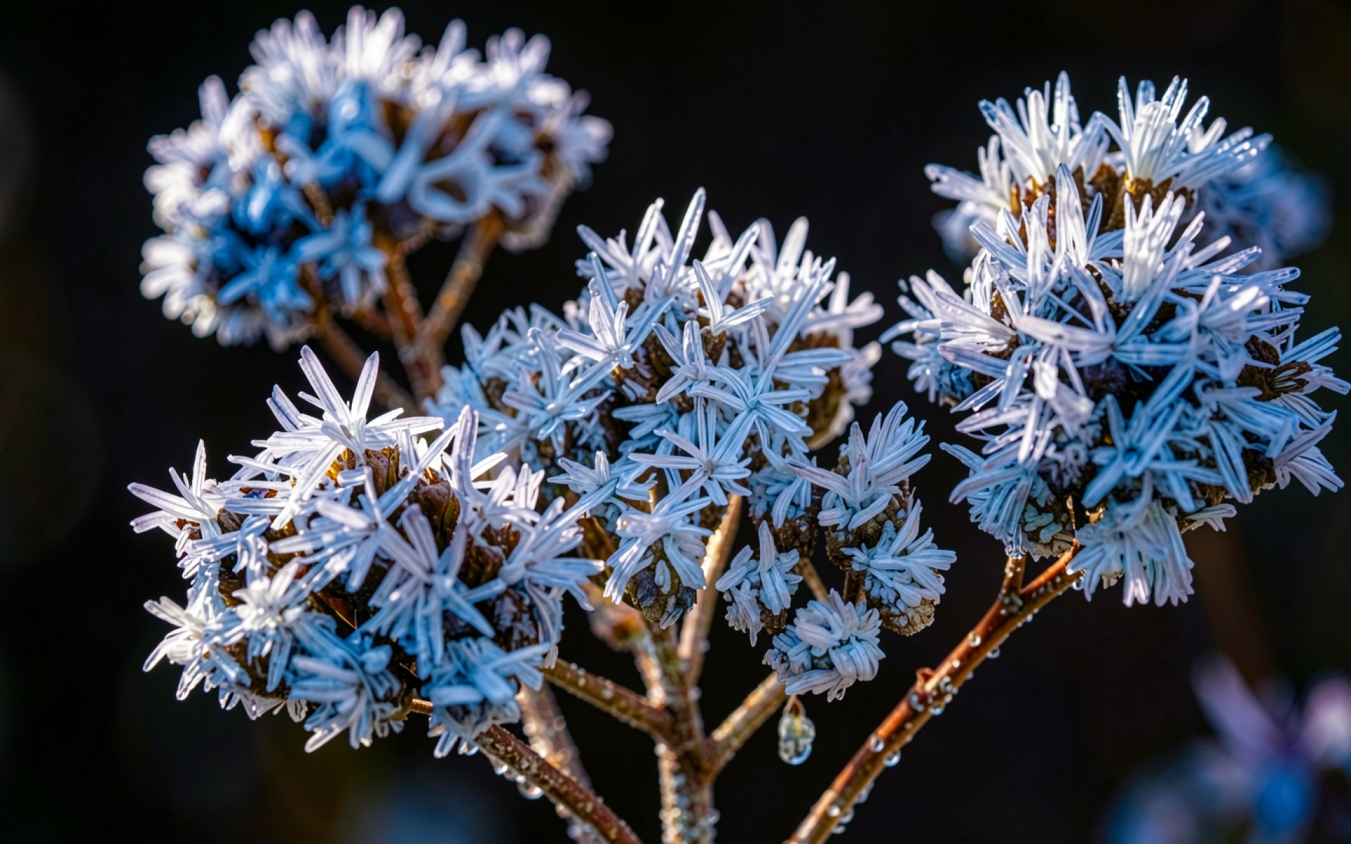 Замороженные соцветия растений в синих зимних тонах обои