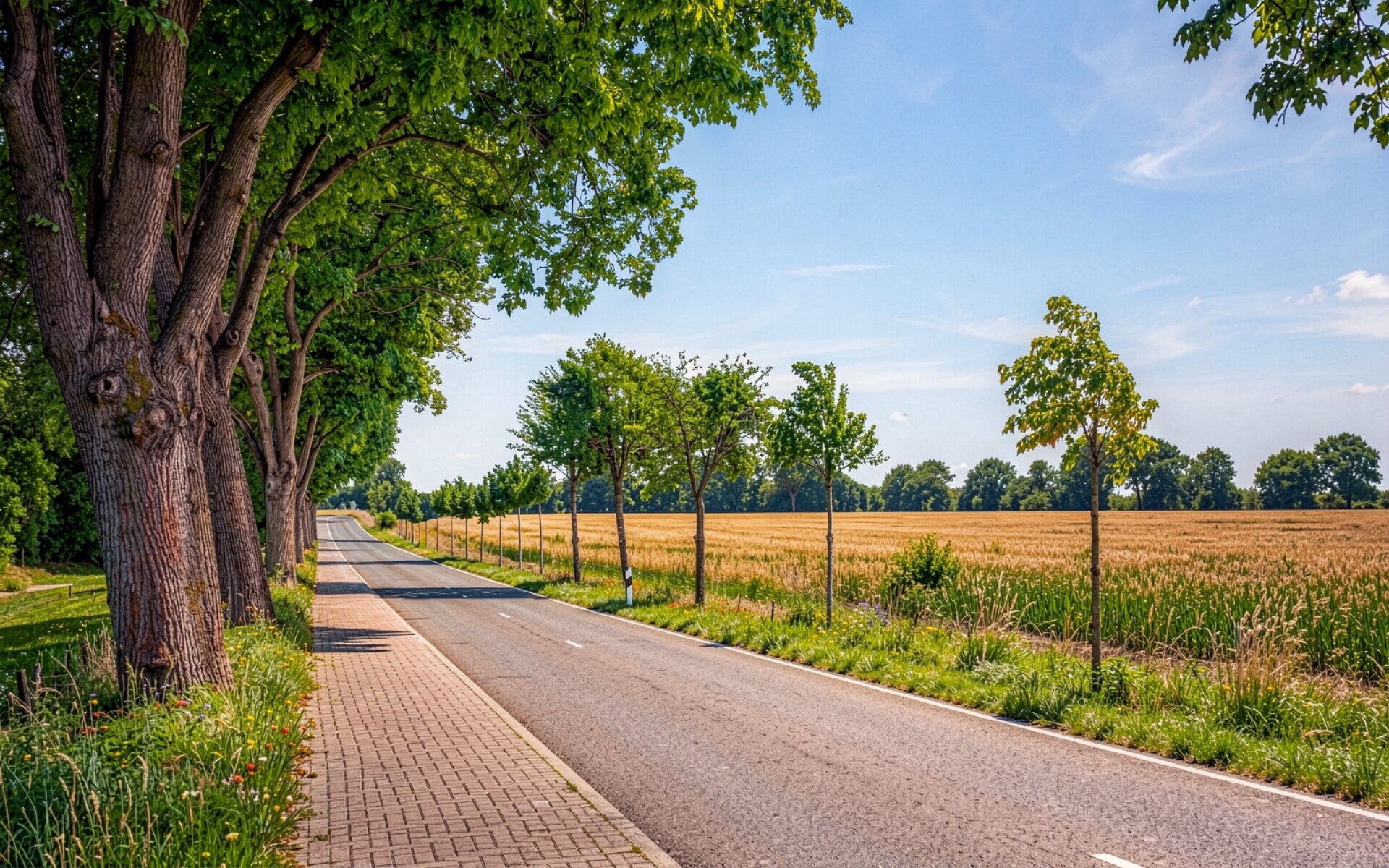 Летняя дорога с зелеными деревьями и полем обои