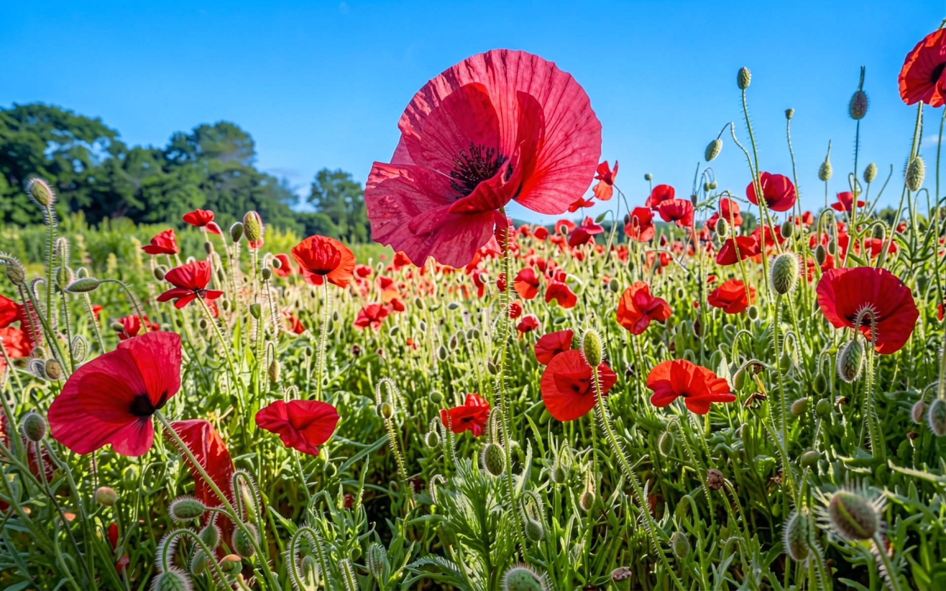 Красные маки в солнечном летнем поле обои