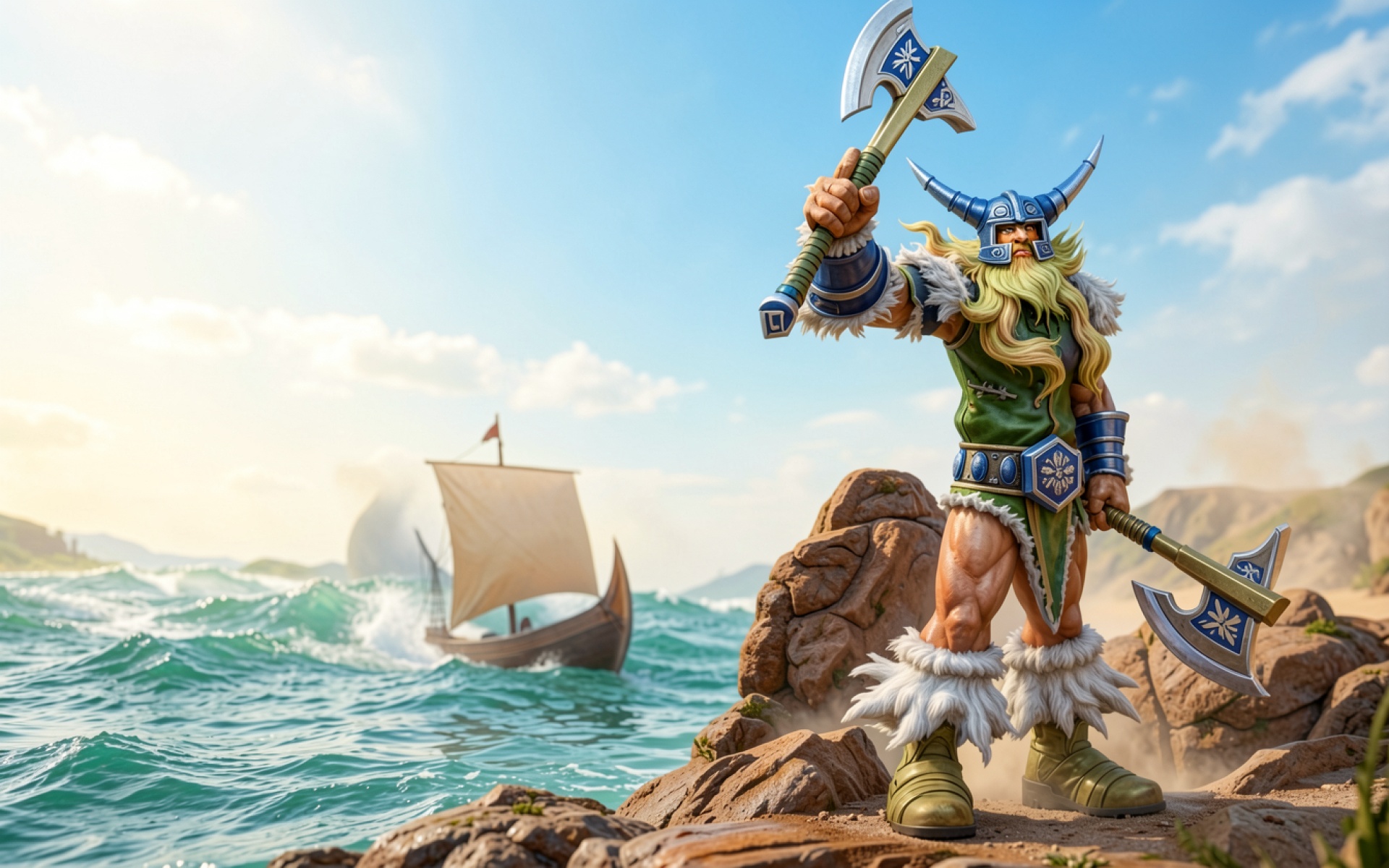 Техническое исполнение изображения акцентирует внимание на текстуре грубой кожи доспехов и ворсе меховых элементов одежды викинга. Освещение имитирует естественный дневной свет, создавая мягкие градиенты на поверхности морской воды и четкие блики на стальных лезвиях топоров. Контраст между темными скалами и светлым небом подчеркивает объем фигуры героя. Перед загрузкой на сайте доступен удобный предпросмотр для оценки качества отображения на вашем экране.