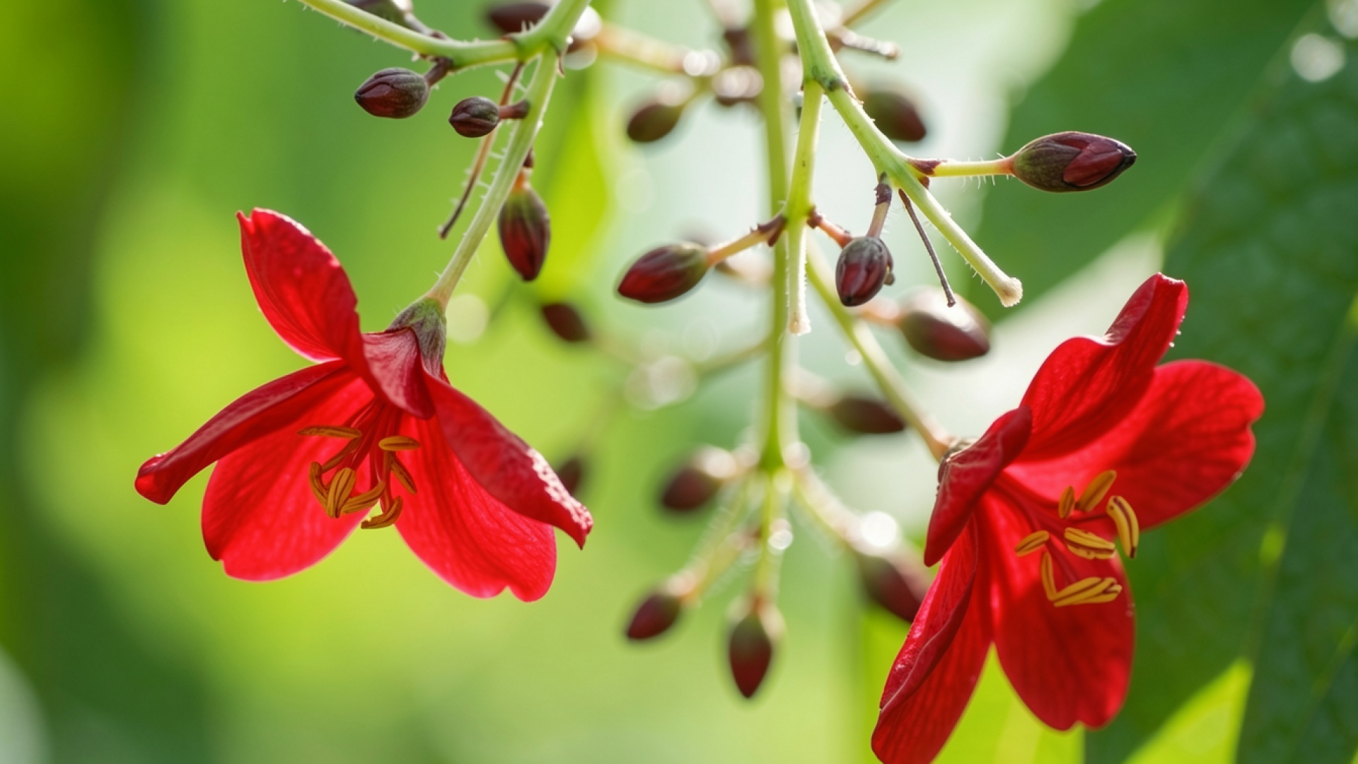 Красные цветы и бутоны на зеленом фоне обои