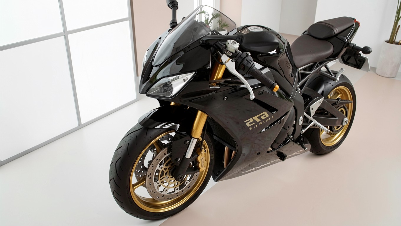 Изображение детально передает глянцевую текстуру черного пластика обтекателей и матовый материал сиденья. Освещение в сцене мягкое, что создает плавные градиенты на белых стенах и подчеркивает золотистый оттенок колесных дисков и передней вилки. Контрастные тени под рамой добавляют глубины композиции, а блики на ветровом стекле отражают чистоту пространства. Перед загрузкой доступен удобный предпросмотр для оценки качества отображения всех элементов на вашем экране.