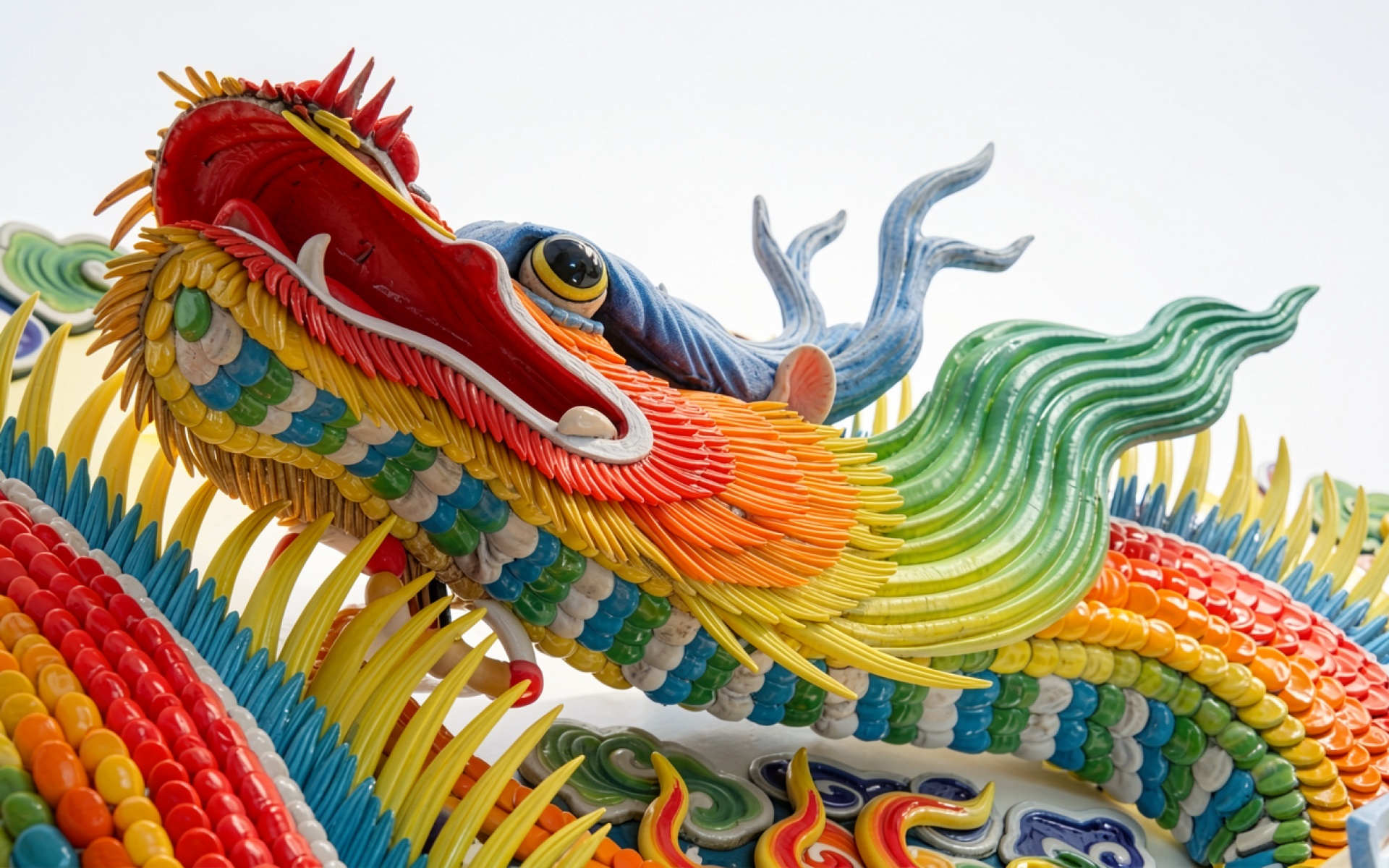 Статуя китайского дракона разноцветная керамическая на белом фоне обои