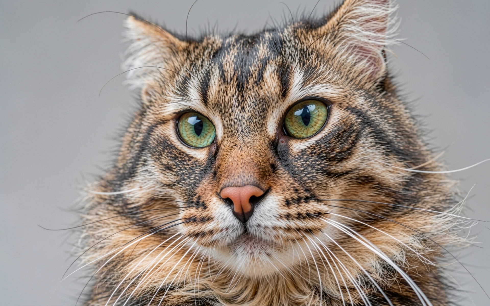 Изображение детально передает текстуру шерсти, где каждый волосок отделен от другого за счет направленного освещения. Контраст между темными полосами и светлым подшерстком создает объем, а мягкие градиенты серого фона акцентируют внимание на лице животного. Блики в зрачках и четкие контуры вибрисс подчеркивают глубину кадра. На сайте доступен удобный предпросмотр перед скачиванием для оценки качества на экране.