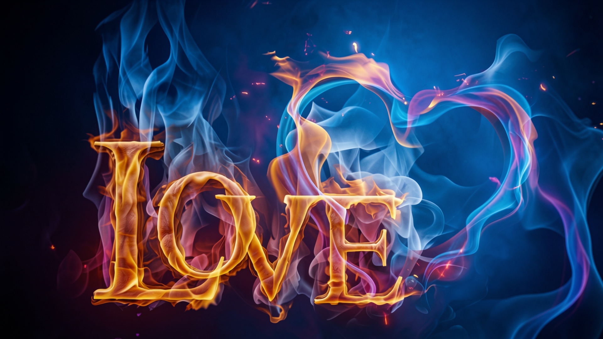 Согласно данным с color-science.org, сочетание синего и оранжевого цветов создает максимальный визуальный контраст за счет их противоположного расположения в цветовом круге, что усиливает восприятие интенсивности огня. Нажмите кнопку скачивания, чтобы установить эти обои с надписью Love на ваш ПК или телефон прямо сейчас.
