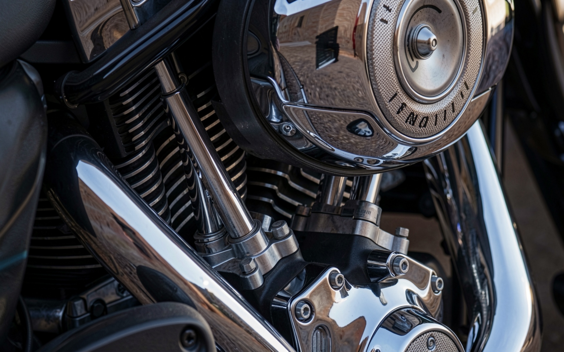 Хромированный двигатель мотоцикла в деталях крупным планом обои