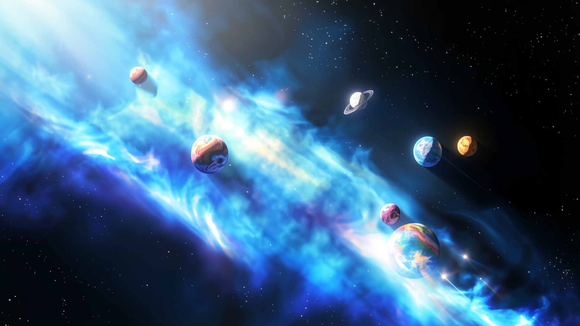 Изображение детально передает текстуру газовых гигантов и скалистых поверхностей небесных тел. Освещение реализовано через контраст ярких звездных вспышек и глубоких теней на темной стороне сфер. Плавные переходы синего и голубого в космическом облаке создают объемную глубину пространства. Сайт предоставляет удобный предпросмотр перед загрузкой для оценки качества отображения на вашем экране.