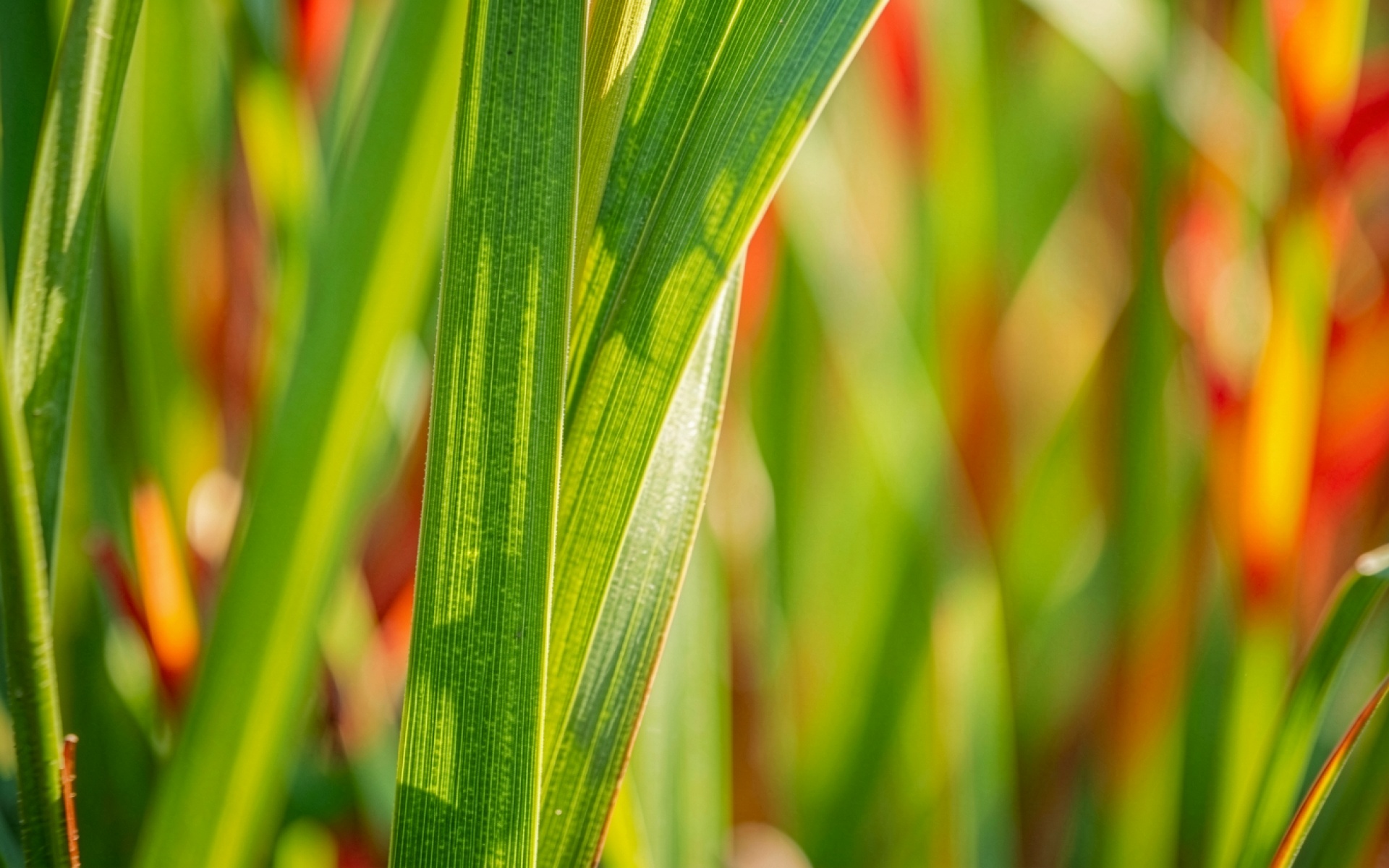 Изображение детально передает продольную текстуру растительных волокон и микроскопические капли росы на поверхности. Контрастное освещение создает четкие блики на изгибах стеблей, а мягкие градиенты фона плавно переходят от насыщенного зеленого к теплым оранжевым тонам. Глубокие тени подчеркивают объем каждого листа, создавая эффект присутствия в природе. На сайте доступен удобный предпросмотр перед загрузкой для оценки качества на экране.