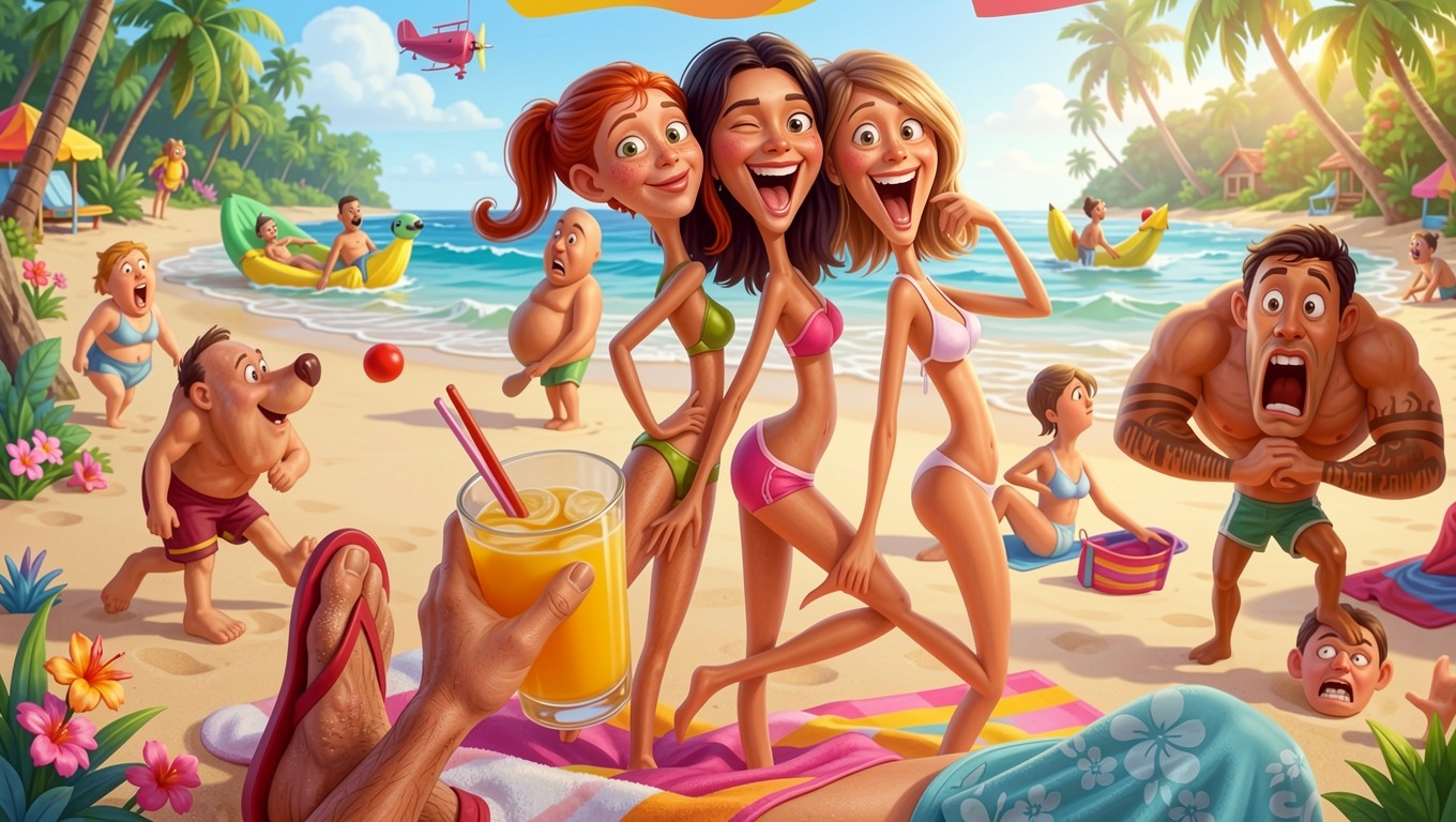 Изображение отличается детальной проработкой текстур песка и бликов на поверхности воды. Освещение имитирует яркий зенитный свет, создавая четкие контрастные тени под персонажами и мягкие градиенты на фоне пальмовых листьев. Цветовая палитра насыщена теплыми оттенками желтого и голубого, что подчеркивает атмосферу отдыха. На сайте доступен удобный предпросмотр перед скачиванием для оценки качества отображения на экране.