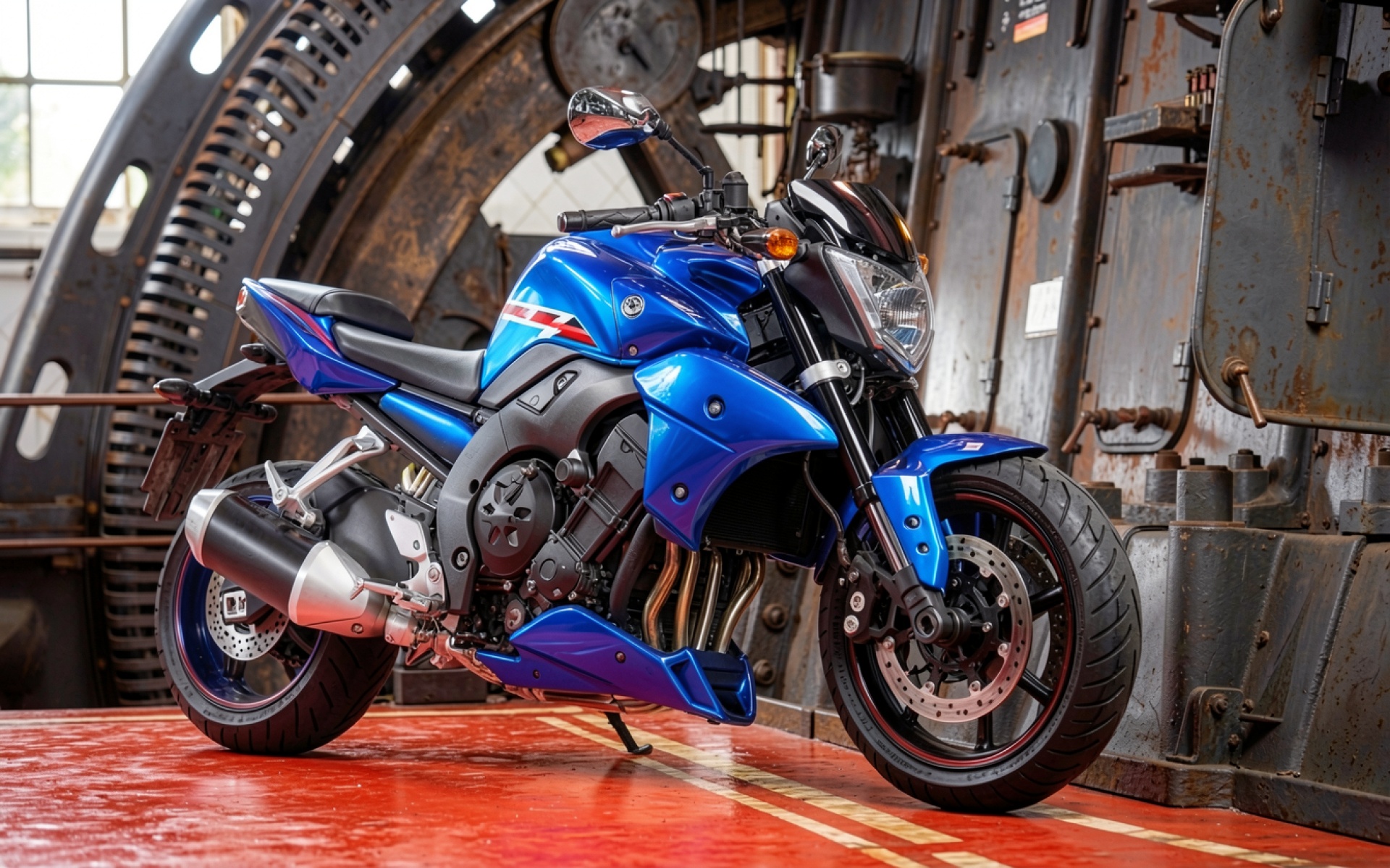 Загрузка JPG обоев Синий мотоцикл Yamaha в индустриальном гараже с нашего сайта необходима потому что файл оптимизирован для установки на рабочий стол и экран телефона.