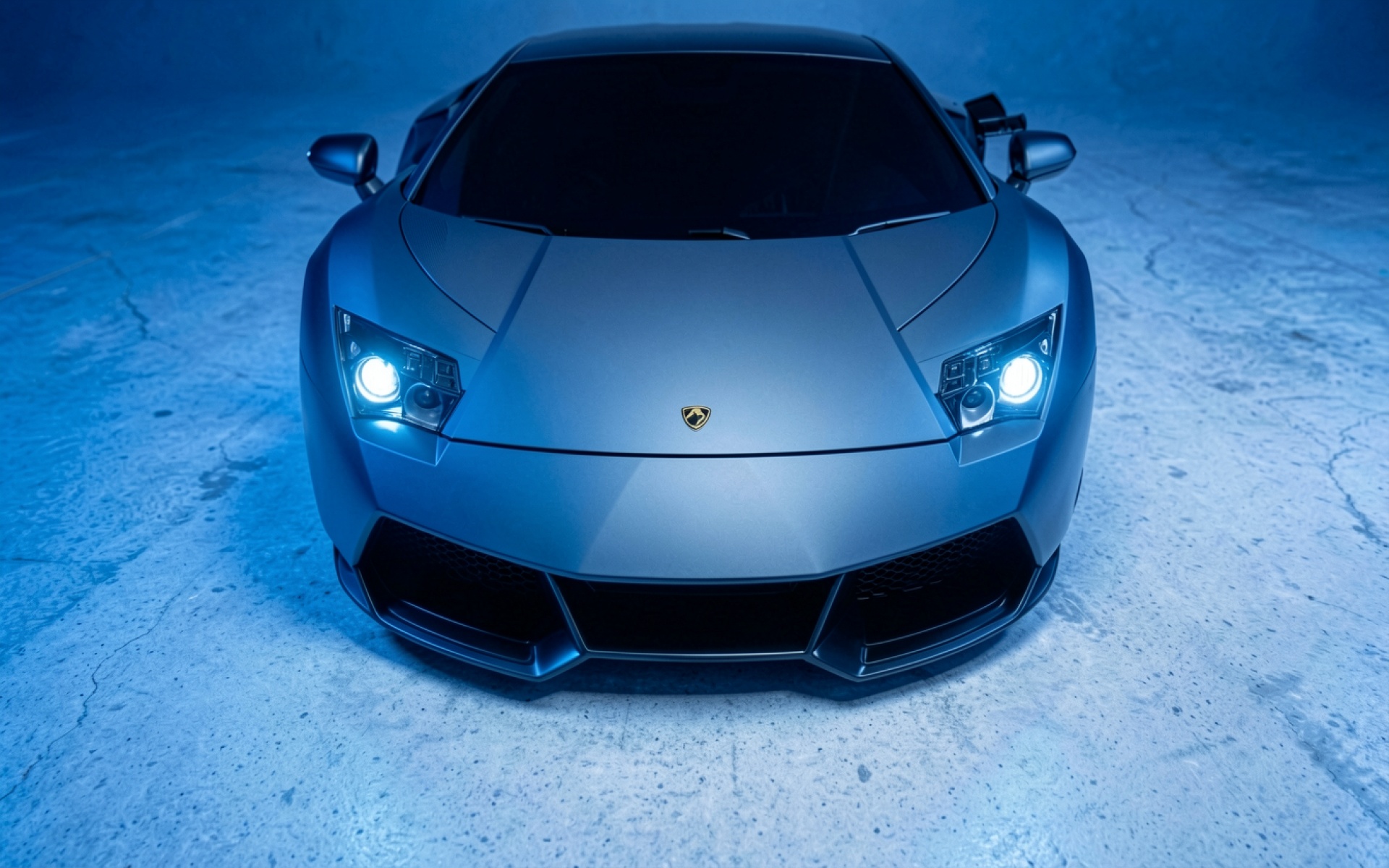 Изображение детально передает матовую текстуру кузова и четкие грани аэродинамического обвеса. Холодное неоновое освещение создает глубокие тени в воздухозаборниках и яркие блики на капоте, подчеркивая геометрию автомобиля. Плавные градиенты синего цвета на бетонном полу создают эффект глубины пространства. На сайте доступен удобный предпросмотр перед загрузкой для оценки качества отображения на вашем экране.