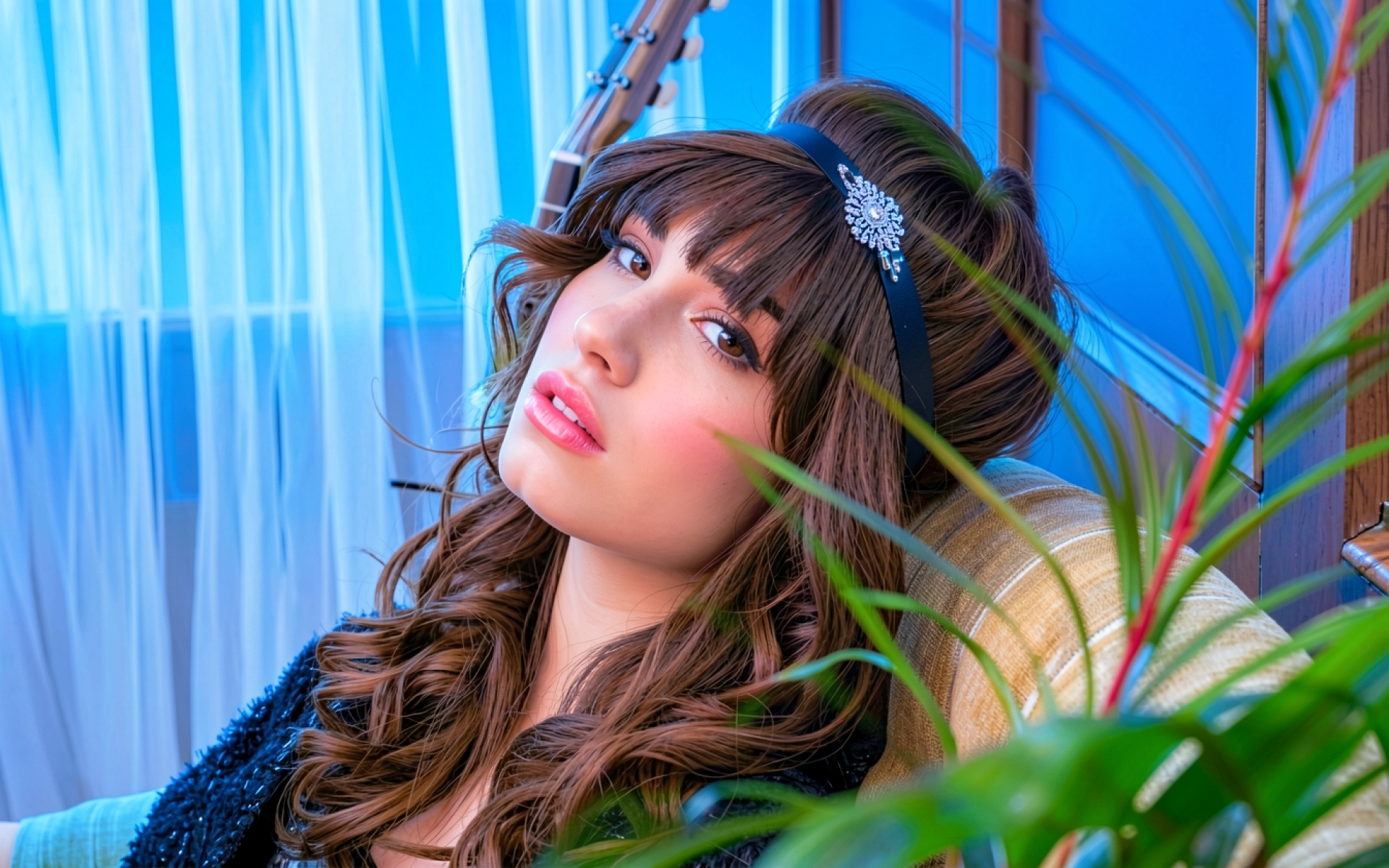 Доступны для скачивания JPG обои Девушка с каштановыми волосами в синем интерьере. Почему стоит скачать их? Файл оптимизирован для установки на рабочий стол и экран телефона.
