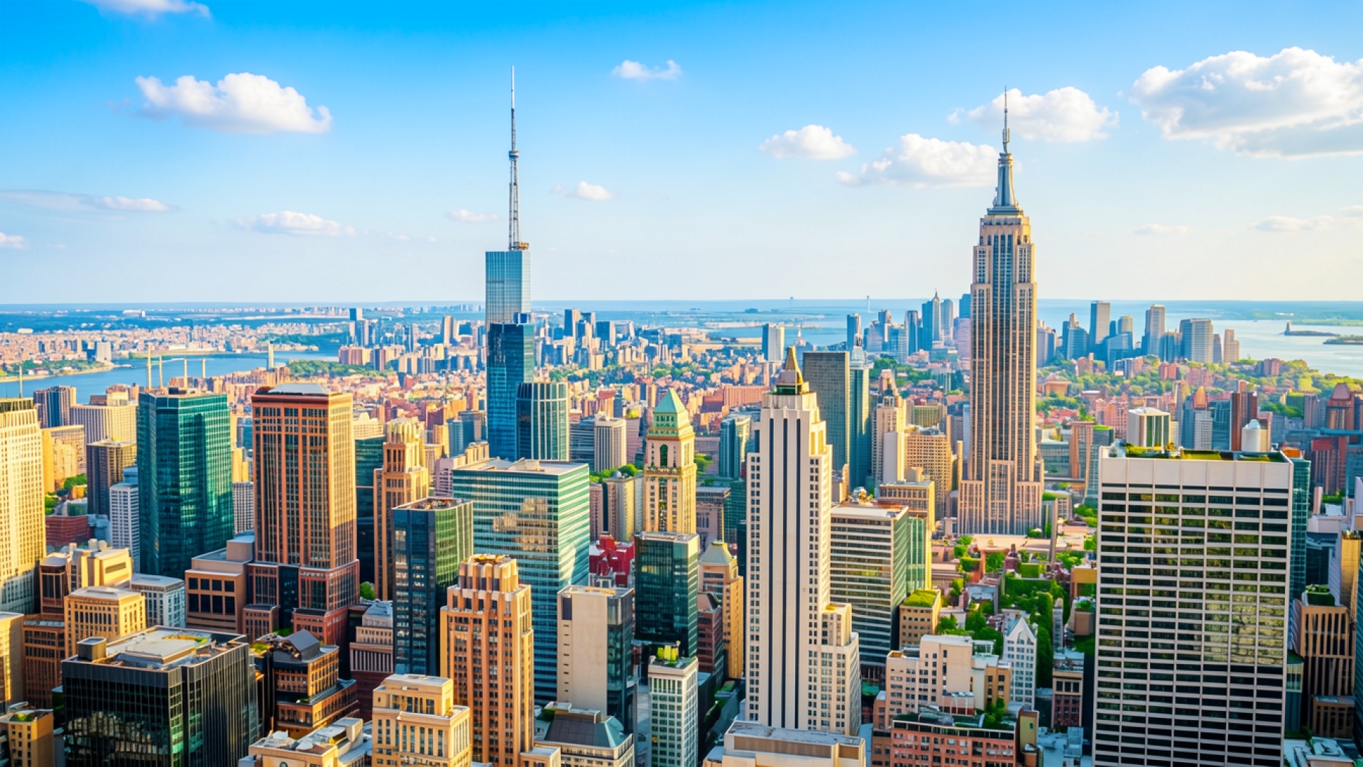 Панорама Нью-Йорка с небоскребами в солнечный день обои