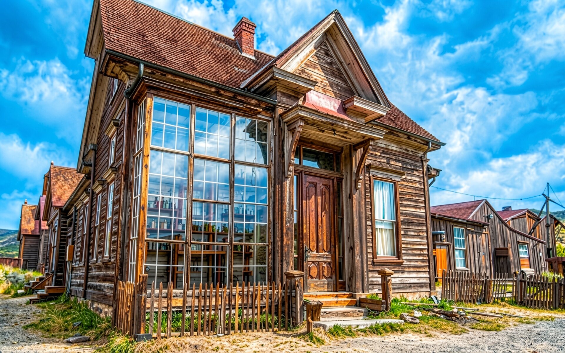Изображение детально передает грубую текстуру состаренного дерева, глубокие трещины на фасаде и естественные потертости краски. Освещение подчеркивает объем каждой доски, создавая контрастные тени в оконных проемах и мягкие блики на стеклах. Фон с градиентом синего неба дополняет общую композицию, создавая баланс между теплыми коричневыми тонами постройки и холодным воздухом гор. На сайте доступен удобный предпросмотр перед загрузкой для оценки качества на экране.